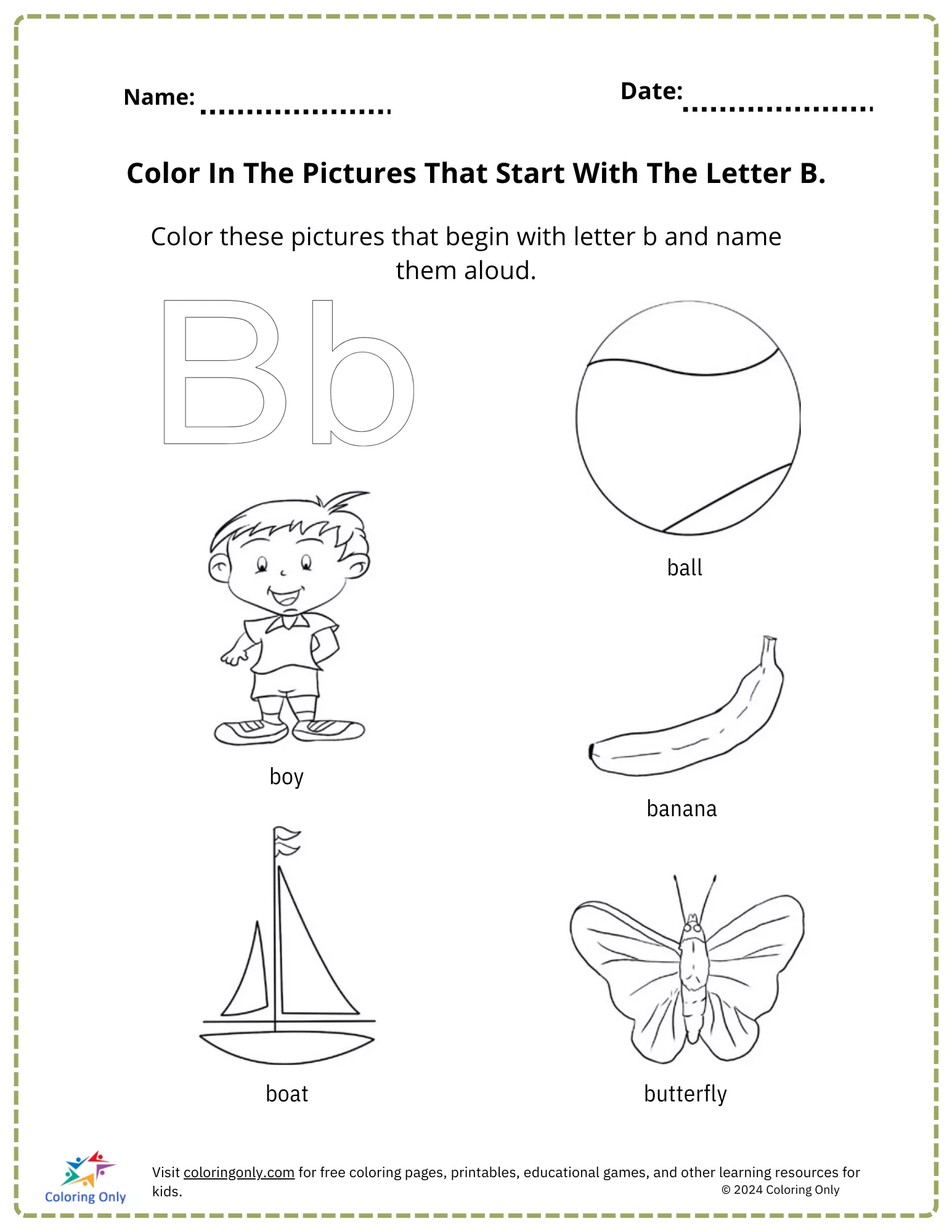 Kinder sind eingeladen, Bilder von Gegenständen auszumalen, die mit dem Buchstaben B beginnen, z. B. ein Ball, ein Junge, eine Banane, ein Boot und ein Schmetterling.