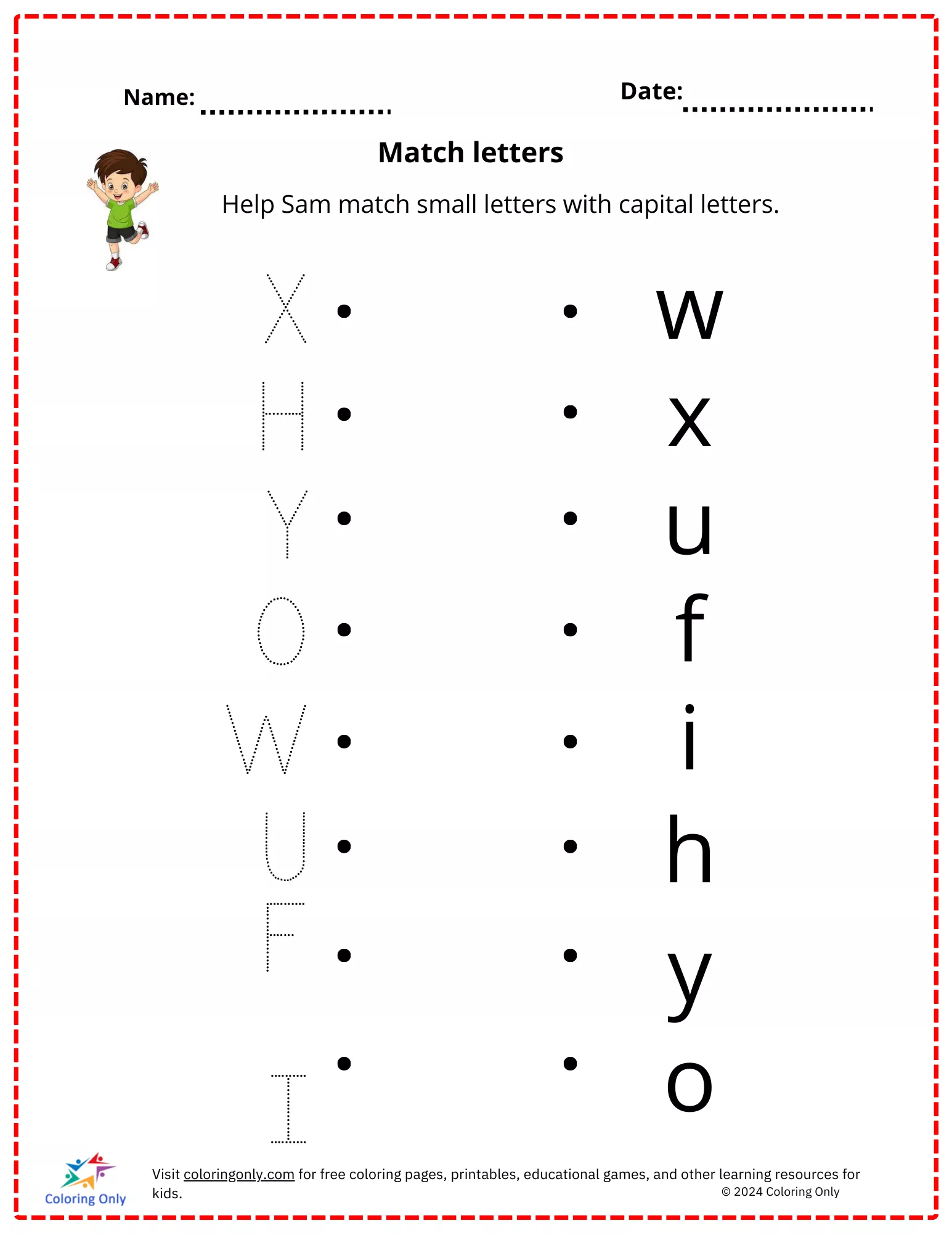 In diesem Arbeitsblatt helfen die Kinder Sam, indem sie kleine Buchstaben mit den entsprechenden Großbuchstaben abgleichen.