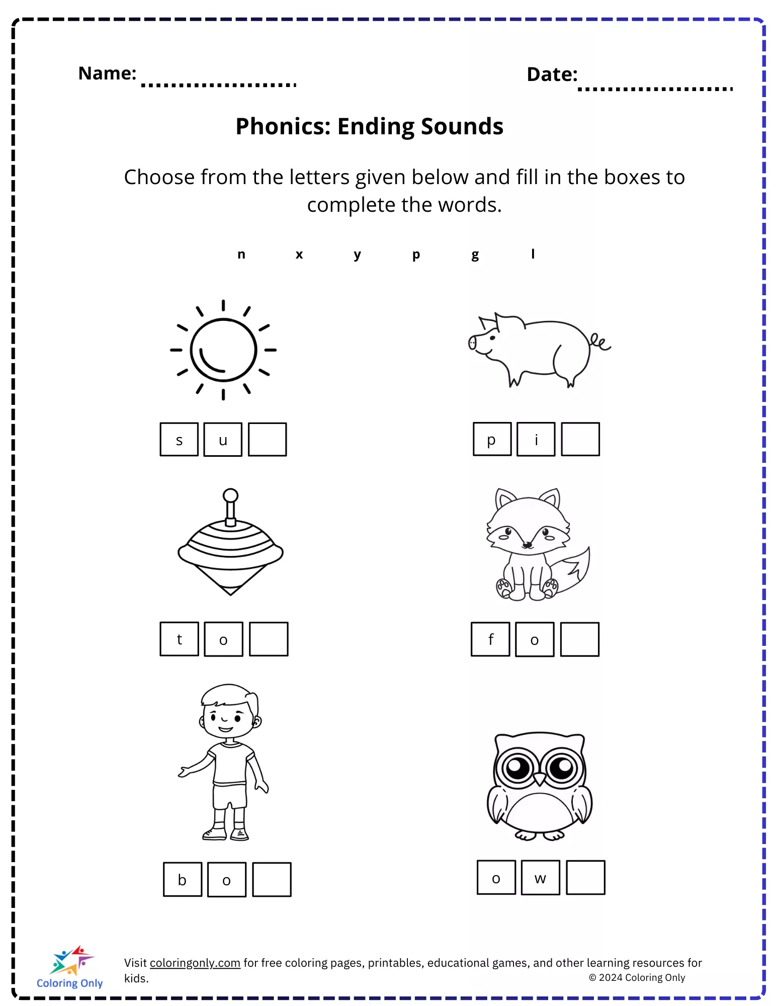 Das Phonics: Ending Sounds Free Printable Worksheet ist ein hervorragendes Werkzeug für Kindergartenkinder, um das Erkennen und Identifizieren von Endlauten in Wörtern zu üben.