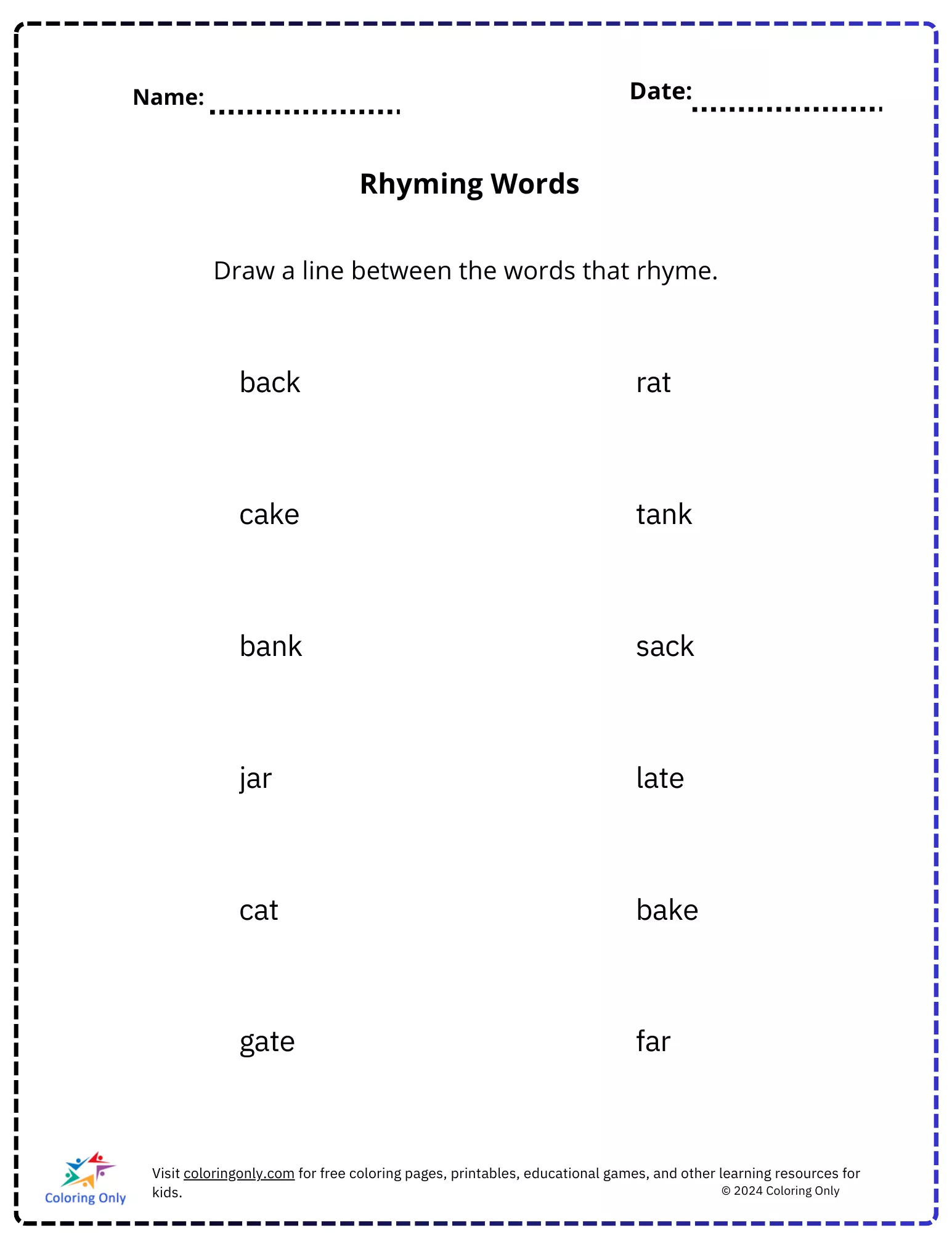 Dieses Arbeitsblatt hilft jungen Lernenden, gereimte Wörter zu erkennen, indem es Linien zeichnet, die zu Wortpaaren passen, die sich reimen.