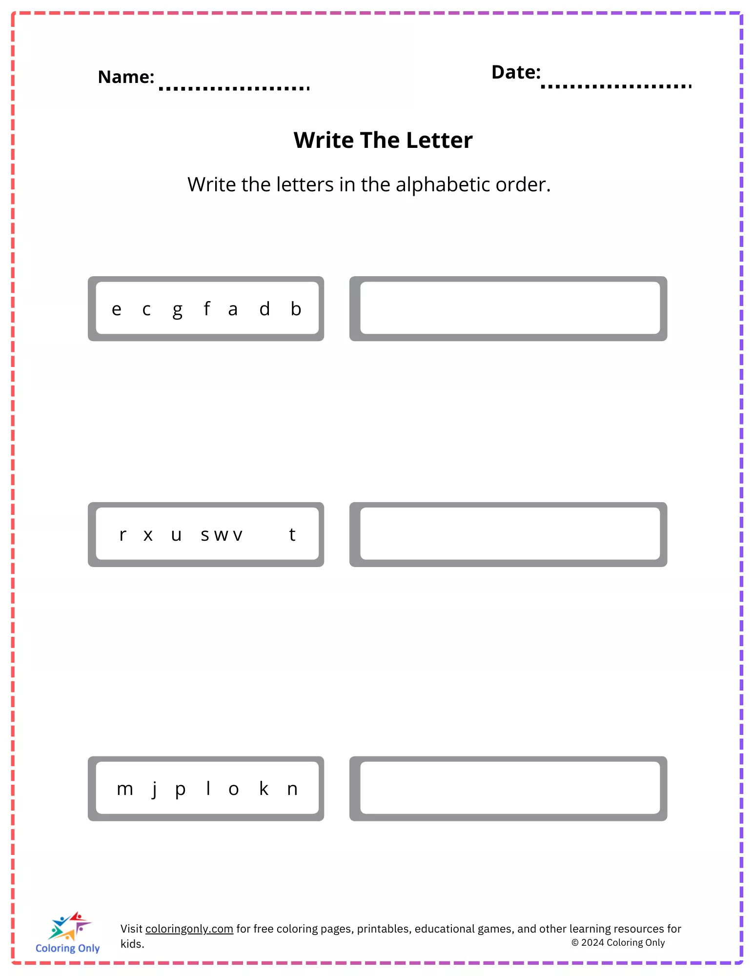 Das "Write The Letter Free Printable Worksheet" ist eine ansprechende Aktivität, die Kindergartenkindern helfen soll, ihre alphabetischen Sortierfähigkeiten zu üben.