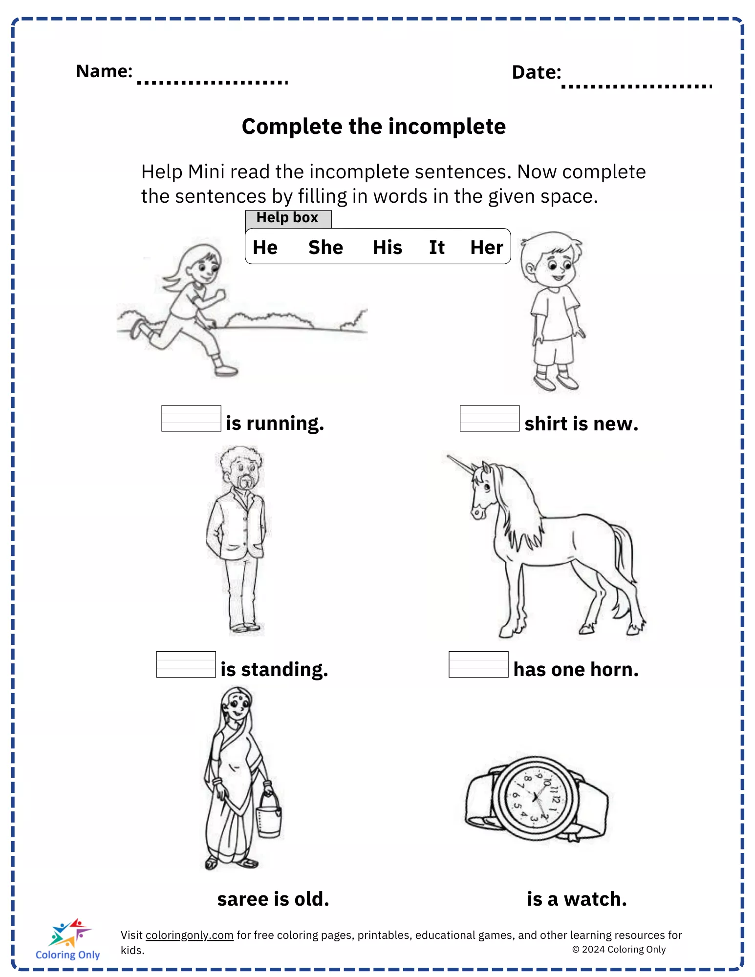 Das kostenlose druckbare Arbeitsblatt "Vervollständigen Sie das Unvollständige ist ein ansprechendes Tool, das für Kindergartenkinder entwickelt wurde, um ihre Fähigkeiten zur Satzbildung zu verbessern.