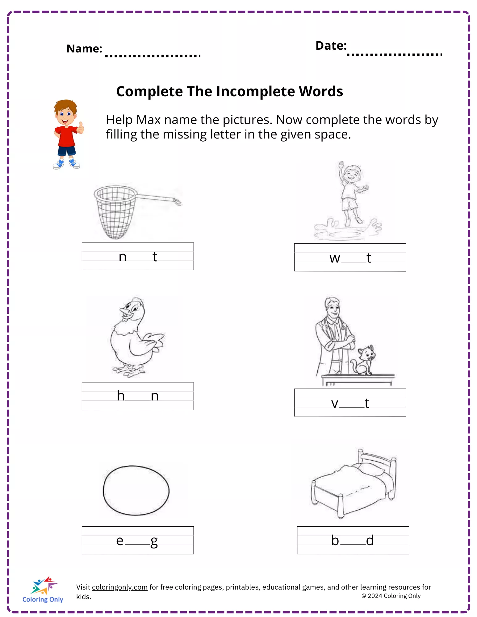 Das "Complete The Incomplete Word Free Printable Worksheet" unterstützt die frühe Lese- und Schreibentwicklung und hilft Kindern, ihre Rechtschreib- und Worterkennungsfähigkeiten in einem spielerischen und ansprechenden Format zu verbessern.