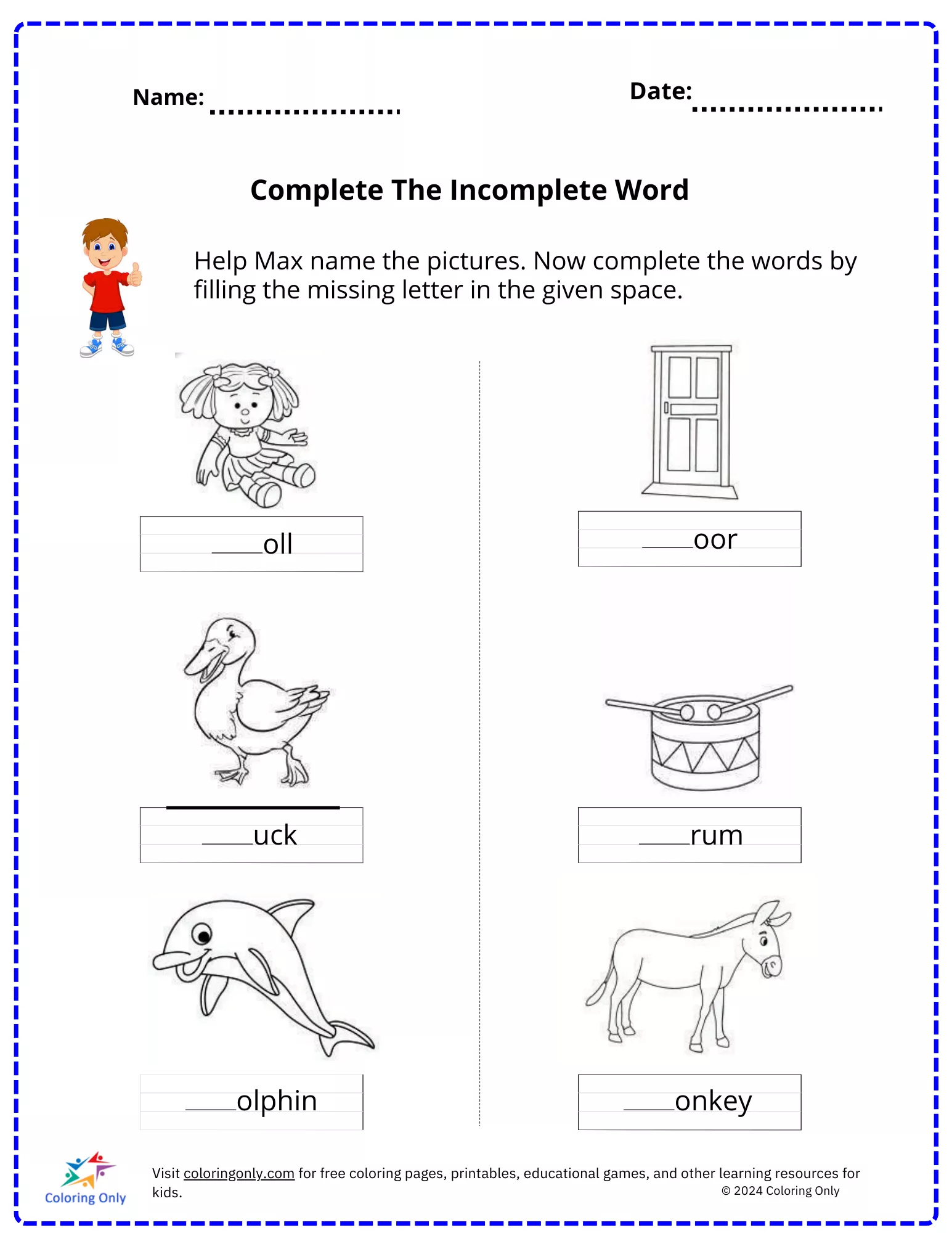 Dieses "Complete The Incomplete Word Free Printable Worksheet" eignet sich perfekt für Lernumgebungen im Klassenzimmer und stärkt das Vertrauen in die frühe Lese- und Schreibfähigkeit.