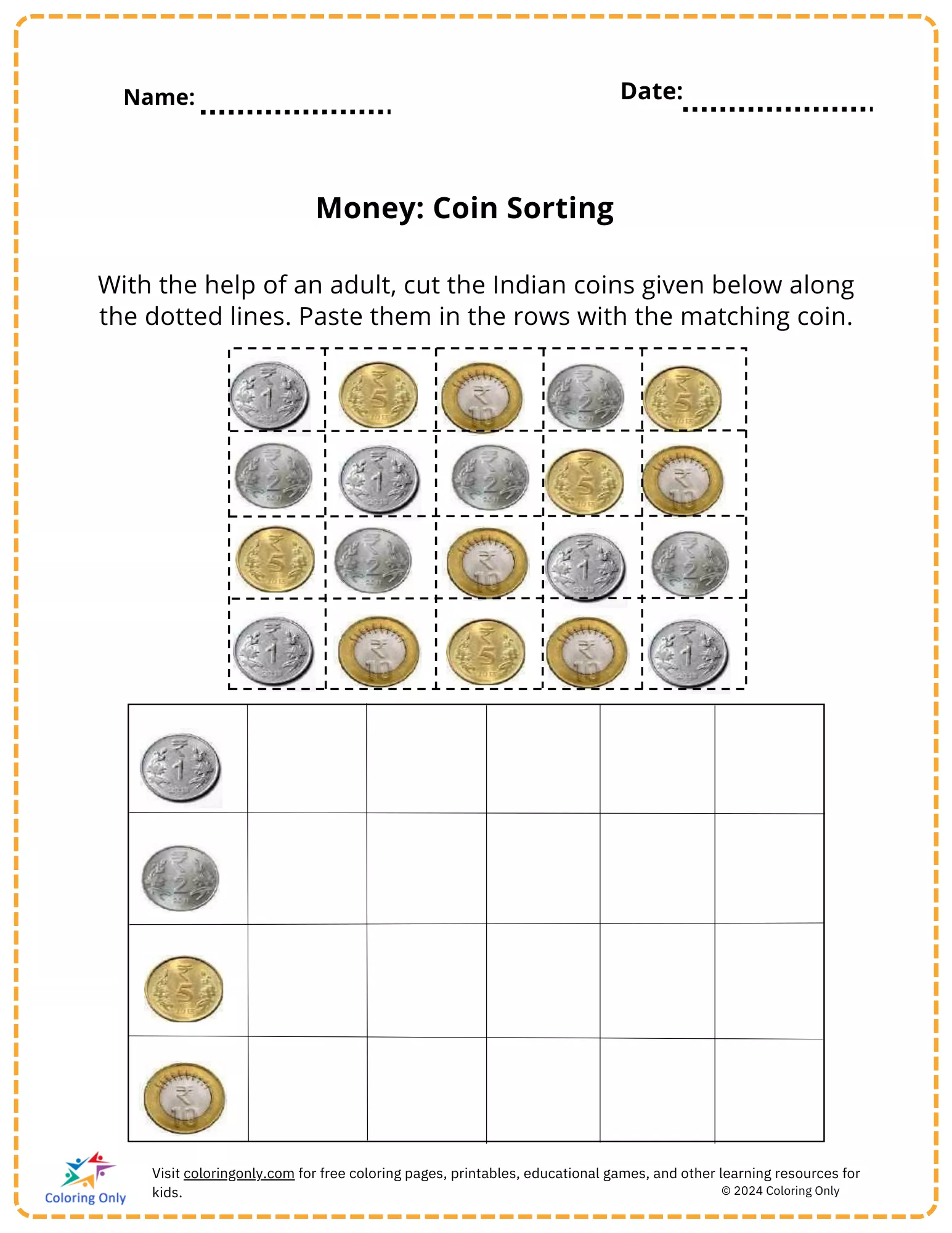 Mit dem "Geld: Münzsortierung Kostenlos druckbares Arbeitsblatt" können Kinder ihre Fähigkeit verbessern, verschiedene Stückelungen von Münzen zu erkennen, ihre Feinmotorik durch Ausschneiden und Einfügen verbessern und die Grundlagen des Geldes auf unterhaltsame und ansprechende Weise erlernen.
