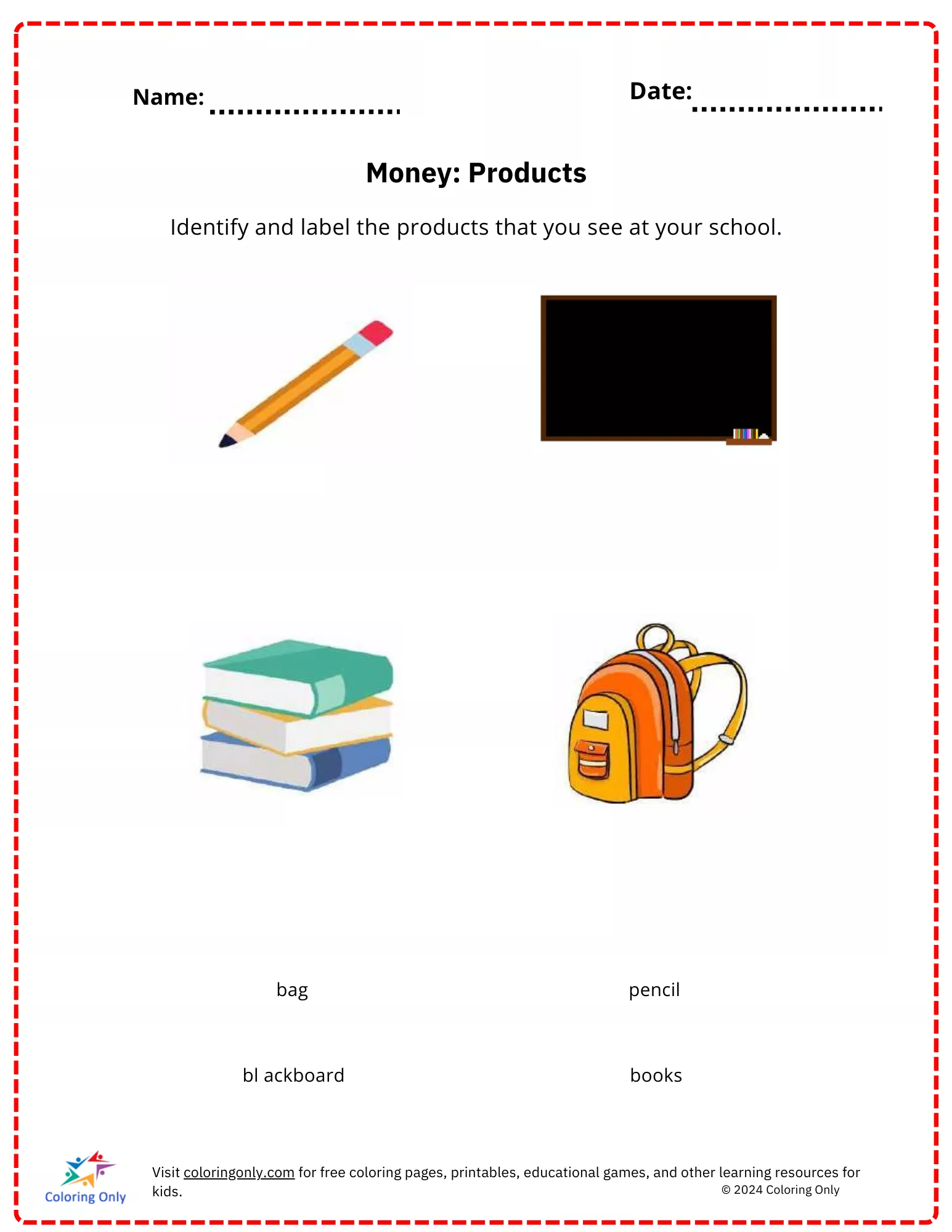 Das "Geld: Produkte Kostenlos druckbares Arbeitsblatt" hilft Kindergartenkindern, Alltagsprodukte zu erkennen und zu kennzeichnen, die häufig in der Schule zu finden sind.