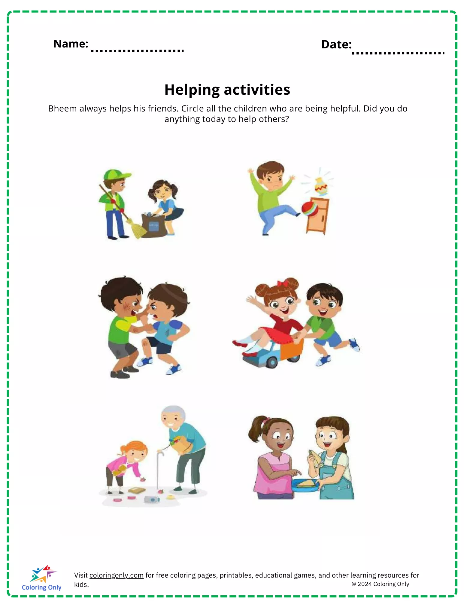 Das kostenlose druckbare Arbeitsblatt für helfende Aktivitäten ermutigt kleine Kinder, hilfreiche Verhaltensweisen zu erkennen. In diesem Arbeitsblatt haben die Kinder die Aufgabe, die Bilder von Kindern zu umkreisen, die an hilfreichen Aktivitäten teilnehmen, z. B. Freunden oder Familie helfen. Diese interaktive Übung hilft Kindergartenkindern, soziale Kompetenzen, Empathie und Verantwortungsbewusstsein zu entwickeln. Durch die Beschäftigung mit diesem kostenlosen druckbaren Arbeitsblatt für Hilfsaktivitäten werden Kinder über ihr Handeln nachdenken und motiviert, darüber nachzudenken, wie sie anderen in ihrem Alltag helfen können.