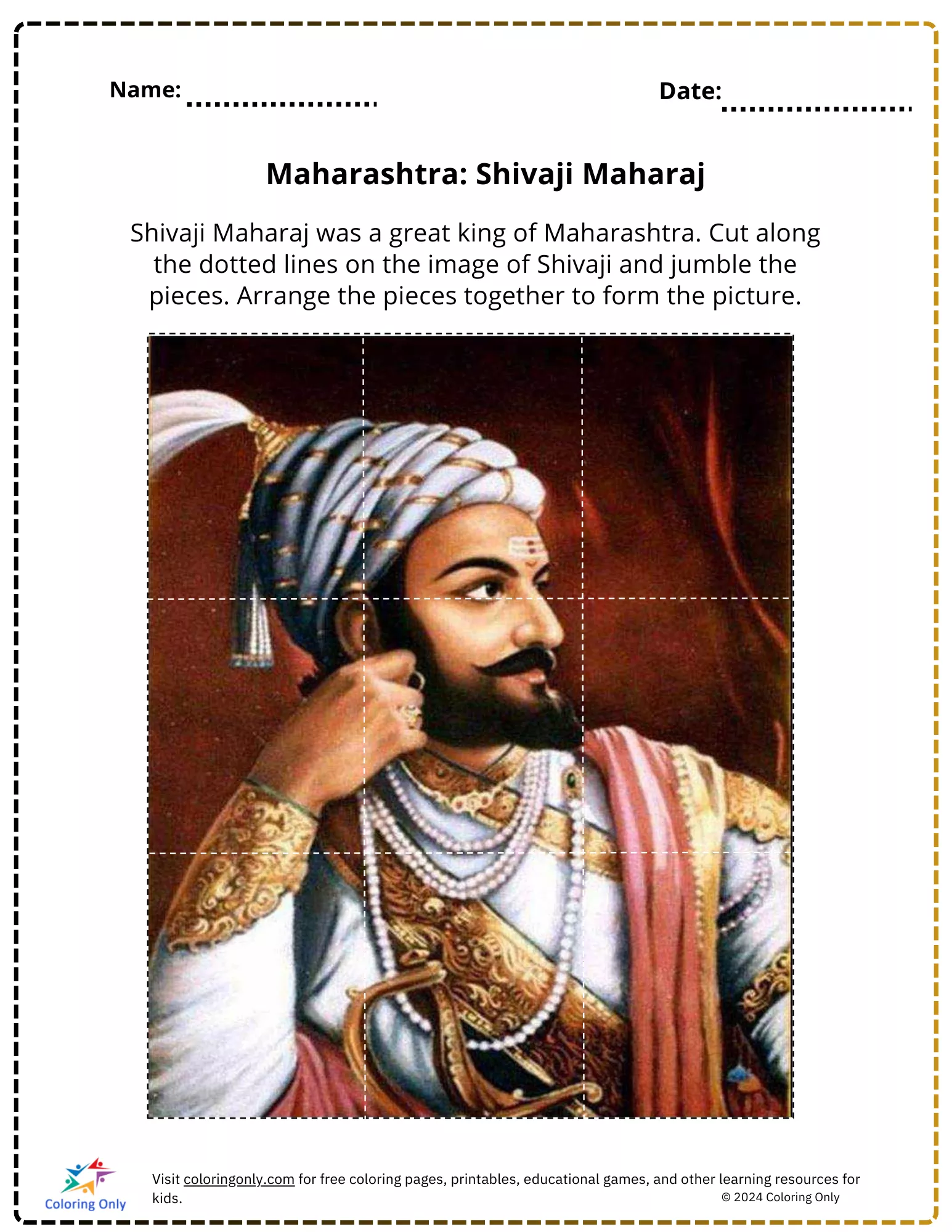 Das kostenlose druckbare Arbeitsblatt Maharashtra: Shivaji Maharaj führt junge Lernende in das Vermächtnis von Shivaji Maharaj, einem verehrten König von Maharashtra, ein. Dieses interaktive Arbeitsblatt ermöglicht es Kindern, entlang der gestrichelten Linien eines Bildes von Shivaji Maharaj zu schneiden und die Teile durcheinander zu bringen. Anschließend können sie die Teile wie ein Puzzle wieder zusammensetzen, um das Gesamtbild dieser historischen Figur zu bilden. Diese Aktivität fördert nicht nur die Feinmotorik, sondern beschäftigt die Kinder auch mit einer unterhaltsamen, lehrreichen Aufgabe über die reiche Geschichte von Maharashtra. Perfekt für den Kindergarten oder das Lernen zu Hause.