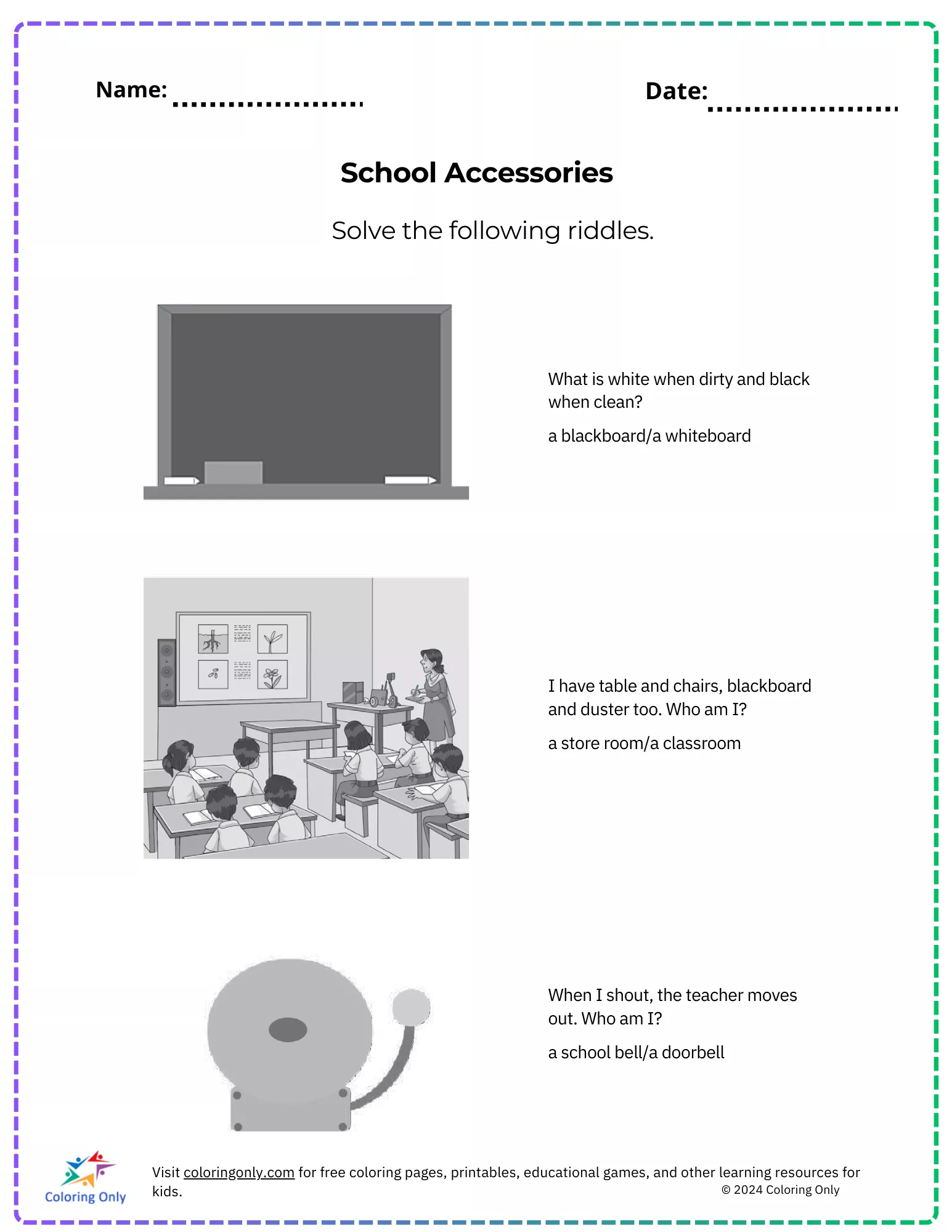 Dieses Arbeitsblatt enthält eine Reihe von Rätseln, die mit gängigen Schulgegenständen verbunden sind und Kindern helfen, Text mit visuellen Elementen zu verknüpfen.