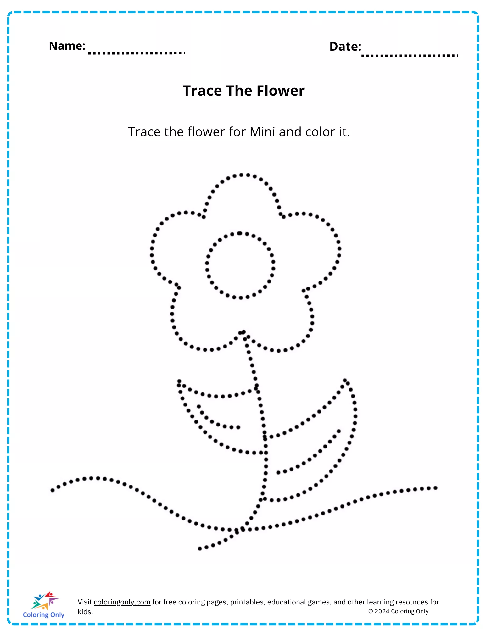 Dieses Arbeitsblatt wurde entwickelt, um die Feinmotorik zu verbessern, und ermutigt Kinder, die gepunkteten Umrisse einer Blume nachzuzeichnen und sie anschließend auszumalen.