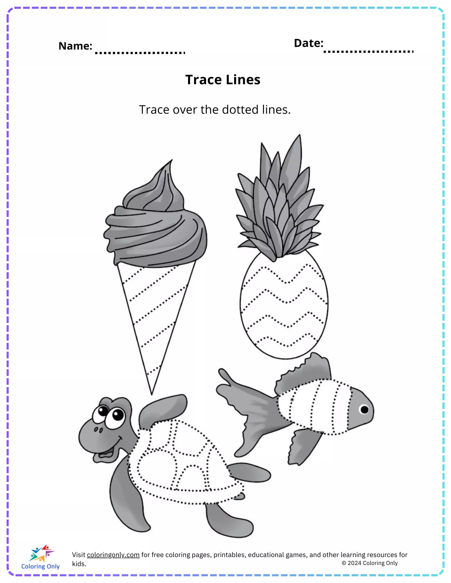 Dieses Arbeitsblatt zeigt eine Vielzahl von Formen, darunter eine Schildkröte, einen Fisch, eine Eiswaffel und eine Ananas, die alle mit gepunkteten Linien umrandet sind.