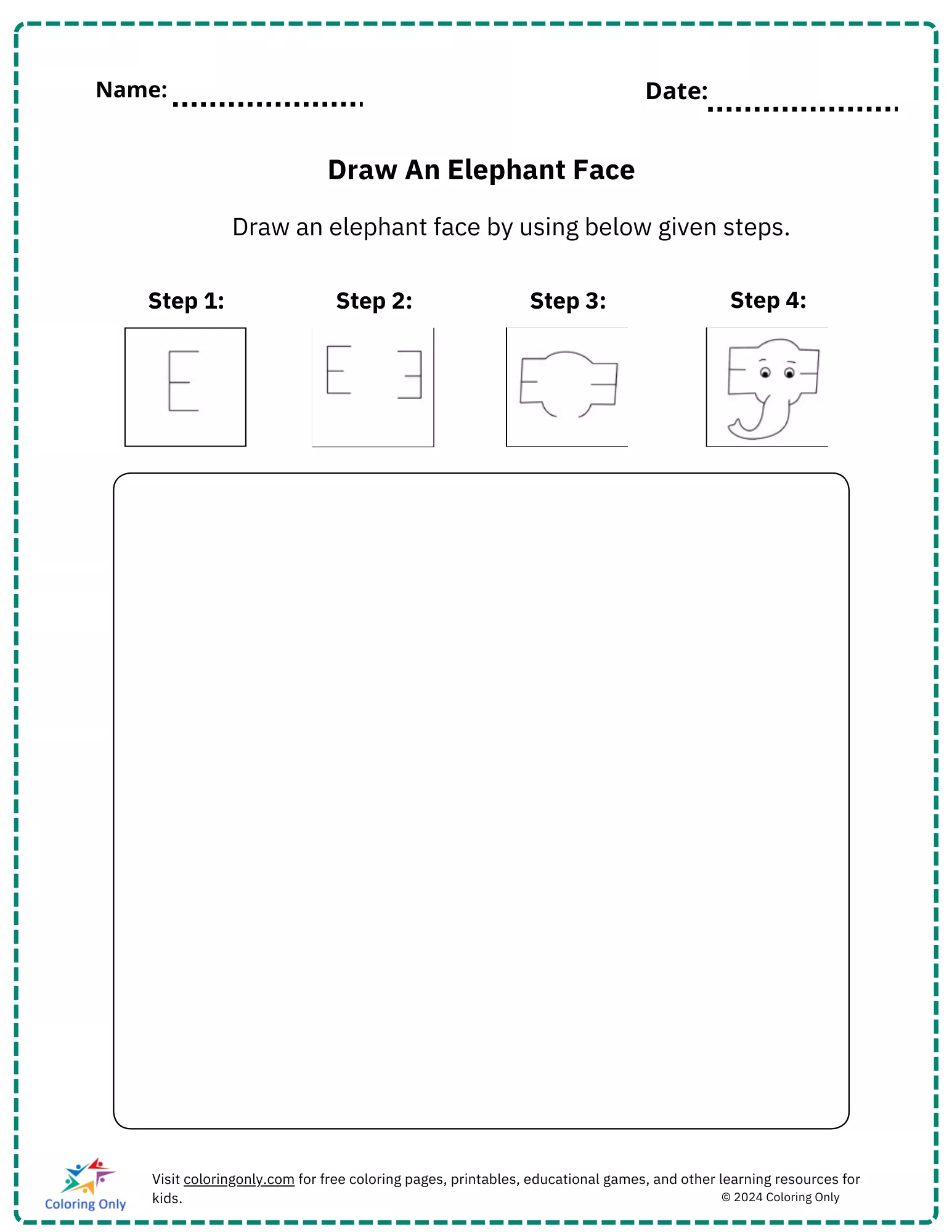 Das kostenlos druckbare Arbeitsblatt "Draw An Elephant Face " eignet sich perfekt für den Kunstunterricht im Klassenzimmer oder für Aktivitäten zu Hause und bietet Kindern ein kreatives und lehrreiches Erlebnis.
