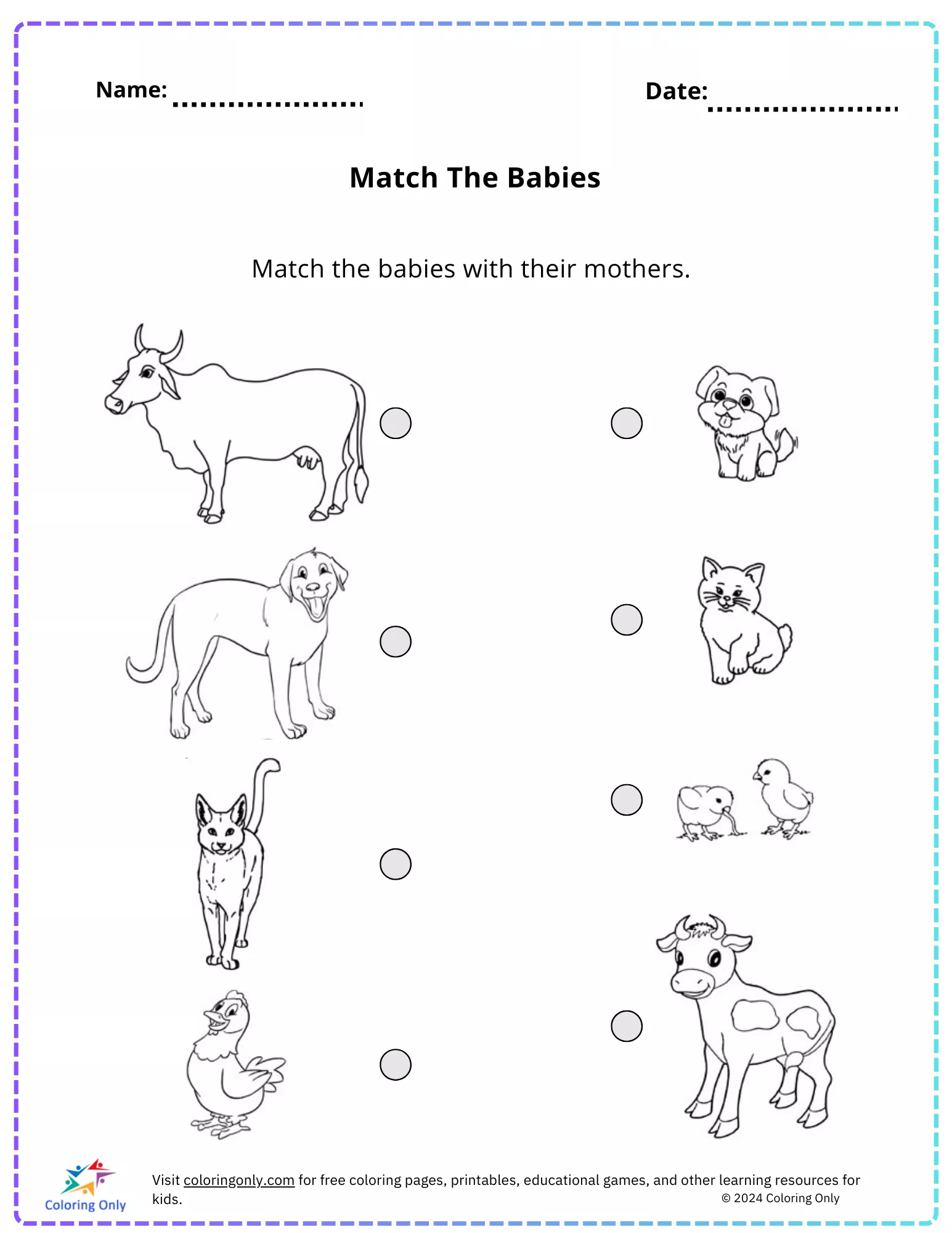 Das Match The Babies Free Printable Worksheet ist eine entzückende Aktivität, die für Kindergartenkinder entwickelt wurde, um ihnen zu helfen, die Beziehungen zwischen Tieren und ihren Jungen zu verstehen.