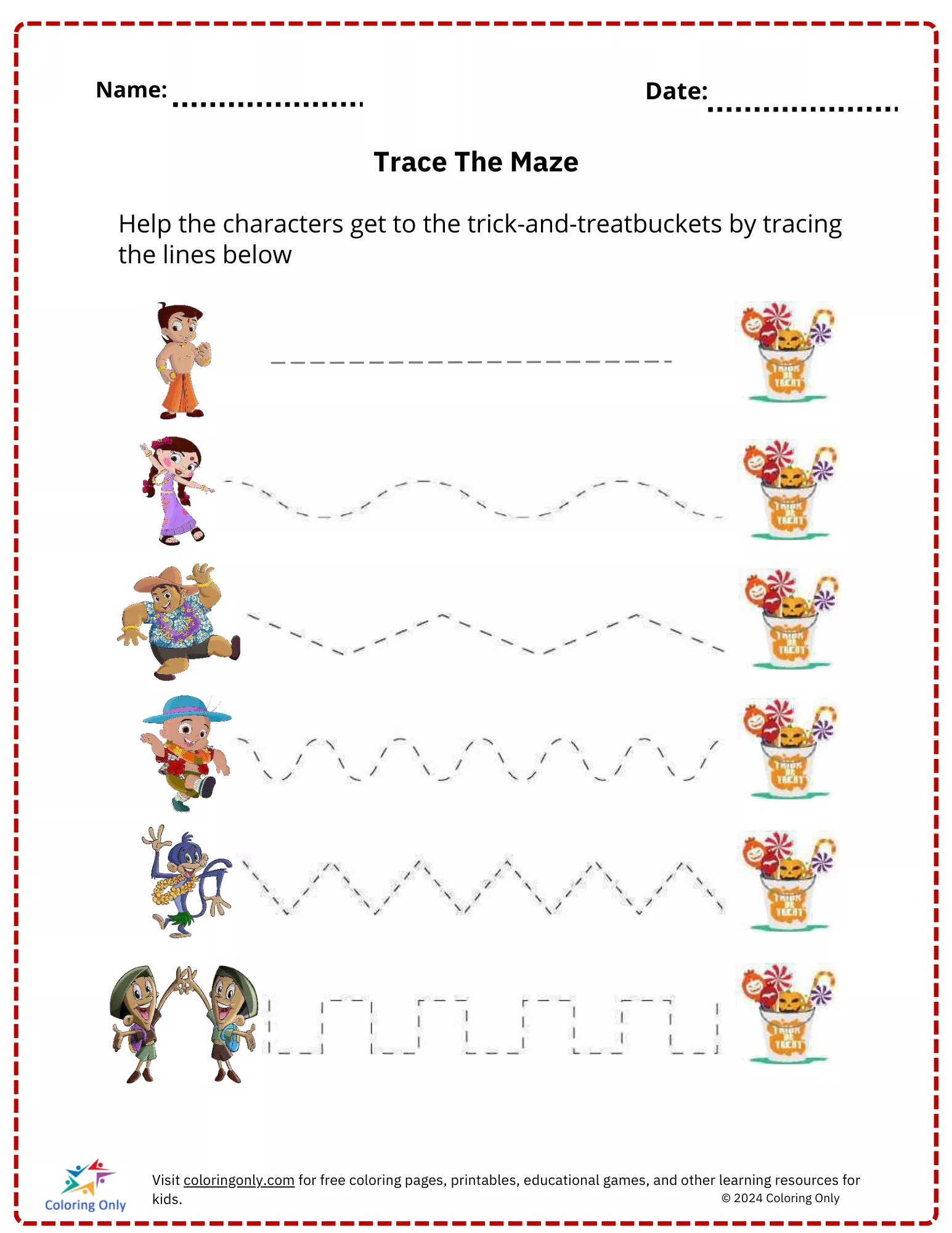 Hilf den Figuren, ihre Süßes-und-Saures-Eimer zu erreichen, indem du die bereitgestellten Linien nachzeichnest.