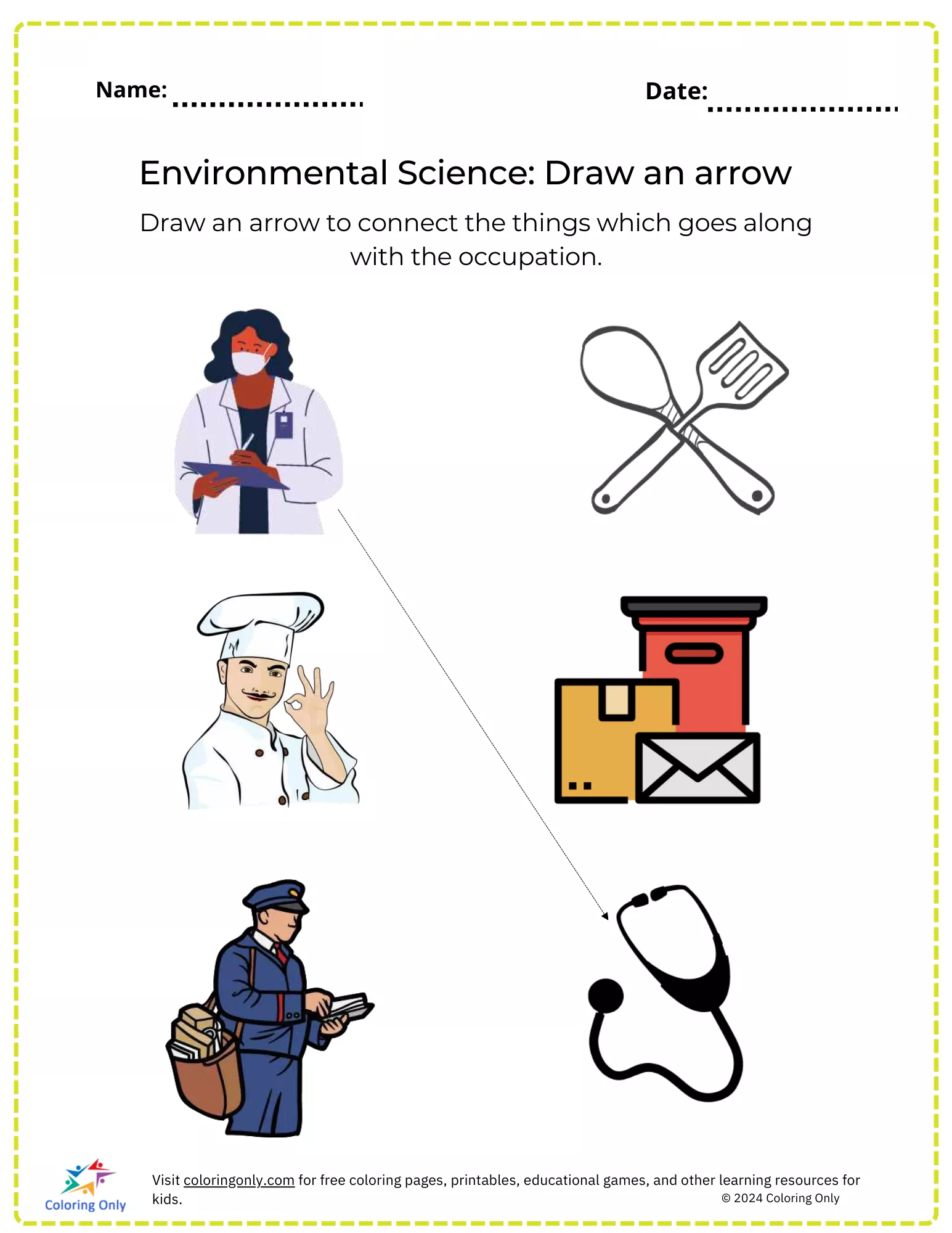 Das Environmental Science: Draw an Arrow Free Printable Worksheet ist eine ansprechende Aktivität, die für junge Lernende entwickelt wurde, um ihnen zu helfen, Berufe mit den damit verbundenen Werkzeugen und Gegenständen zu verbinden.