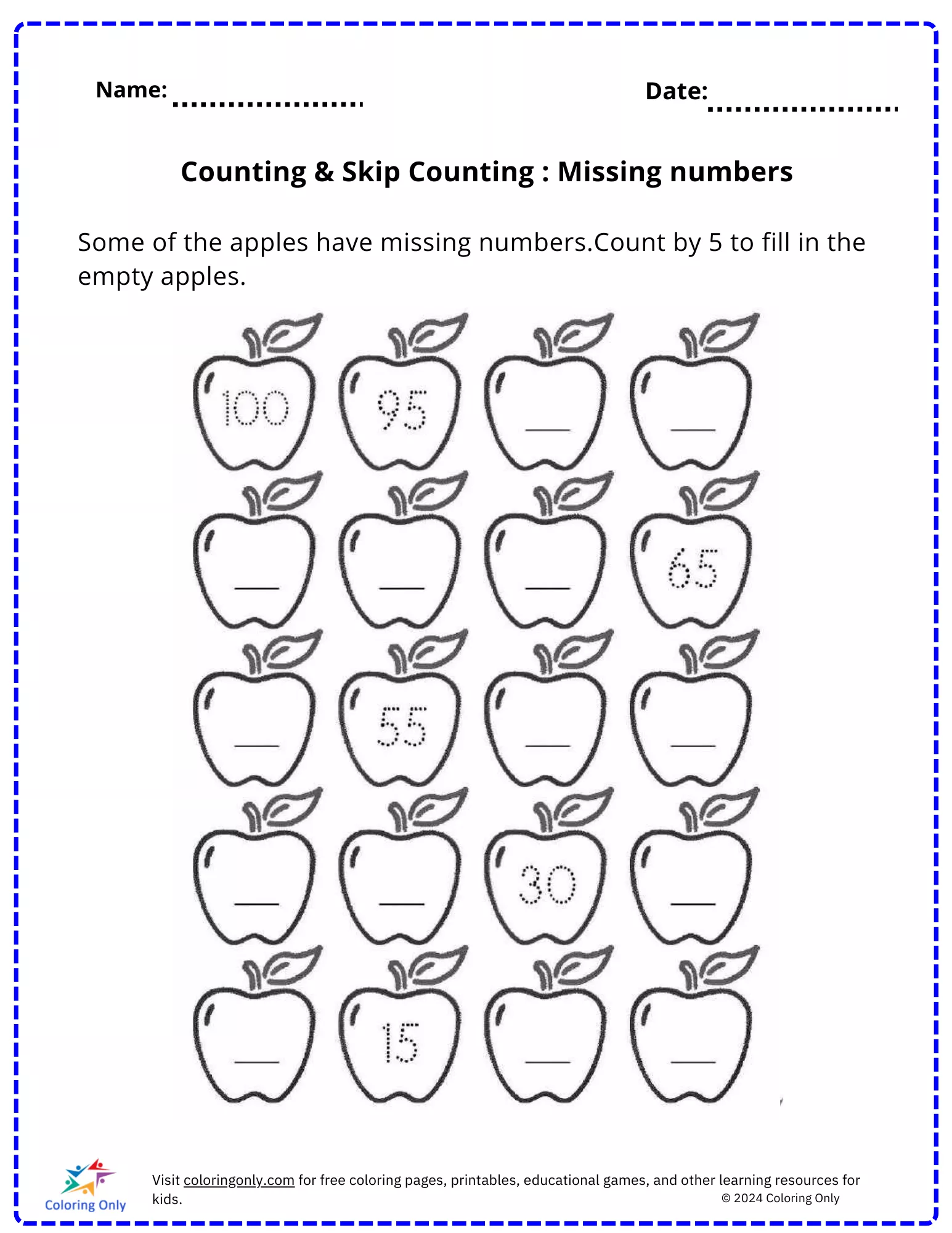 Dieses ansprechende Arbeitsblatt präsentiert Äpfel mit fehlenden Zahlen und ermutigt die Kinder, nacheinander zu zählen und die Lücken auszufüllen.