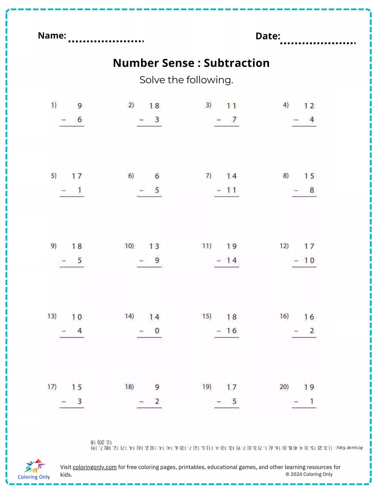 Es enthält eine Reihe grundlegender Subtraktionsaufgaben, die den Kindern helfen, ein ausgeprägtes Verständnis des Zahlensinns und der arithmetischen Operationen zu entwickeln.
