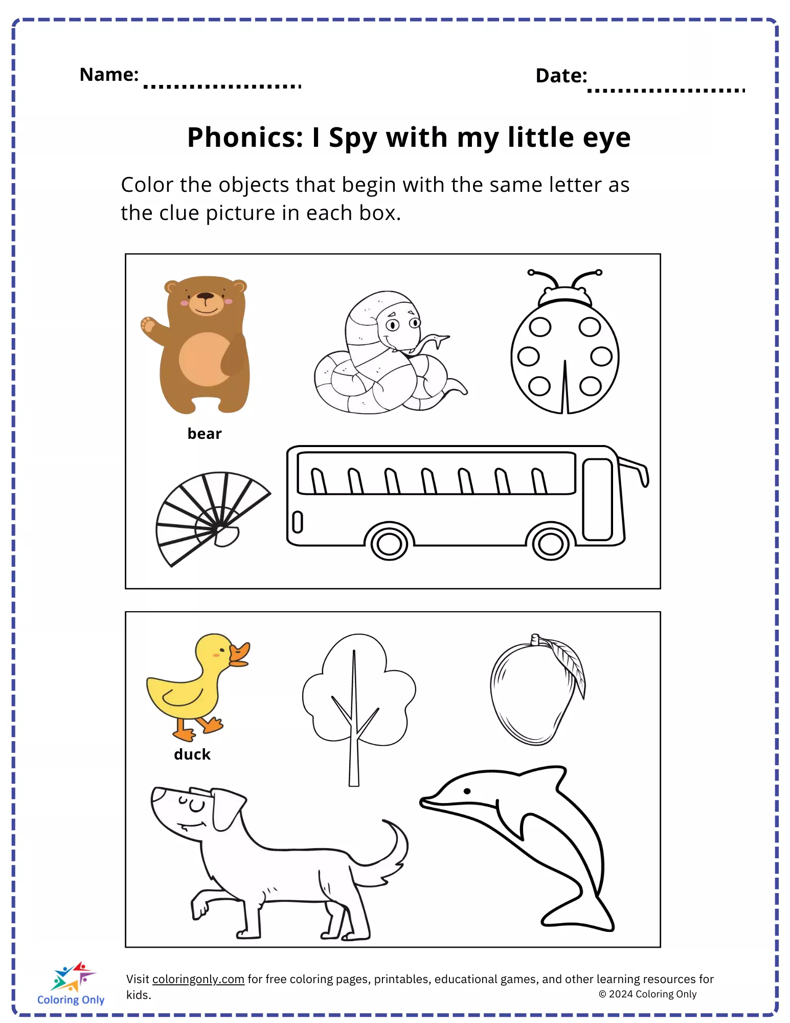 Das Phonics: I Spy with my Little Eye Free Printable Worksheet ist eine unterhaltsame und lehrreiche Aktivität, die entwickelt wurde, um die Buchstabenerkennungsfähigkeiten von Vorschulkindern zu stärken.