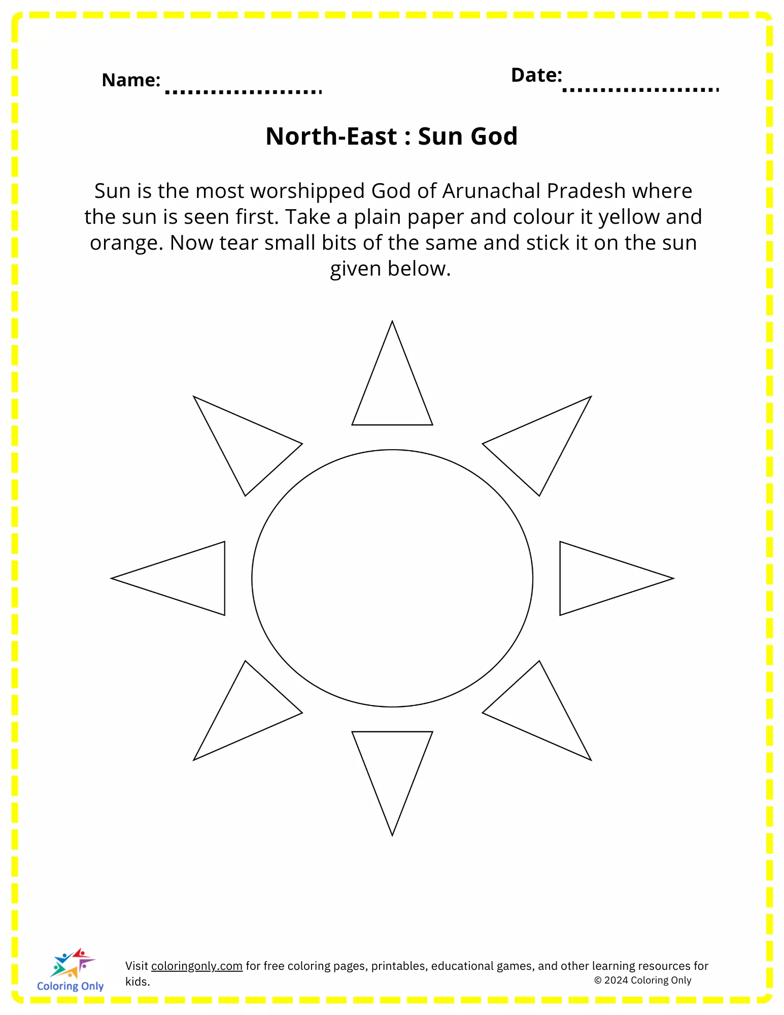 Dieses Arbeitsblatt stellt Kindern den Sonnengott vor, eine verehrte Gottheit in Arunachal Pradesh, wo die Sonne zum ersten Mal zu sehen ist.
