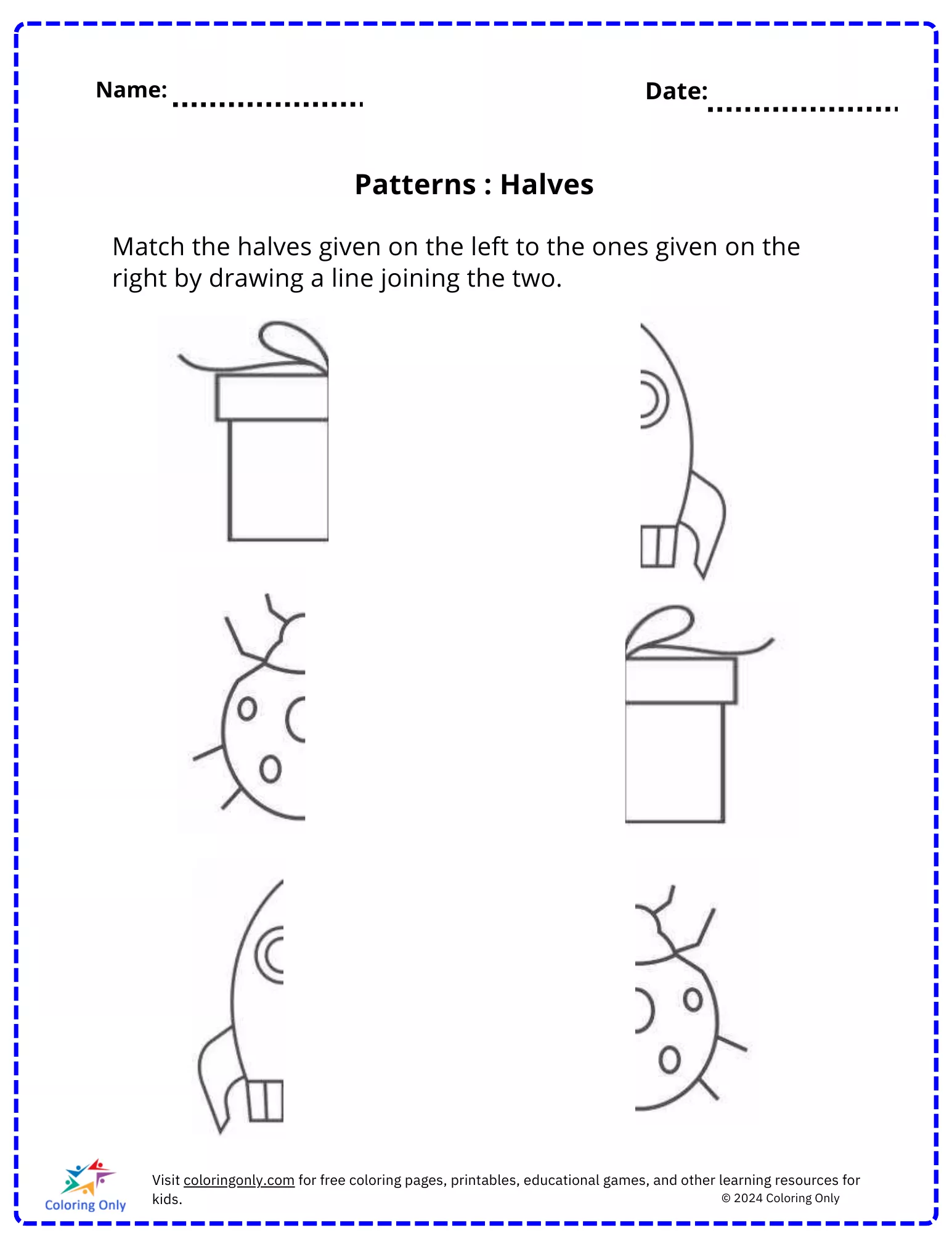 Das Patterns: Halve Free Printable Worksheet ist ideal für den Einsatz im Klassenzimmer und zu Hause und bietet eine spielerische Möglichkeit, wichtige frühkindliche Lernfähigkeiten aufzubauen.
