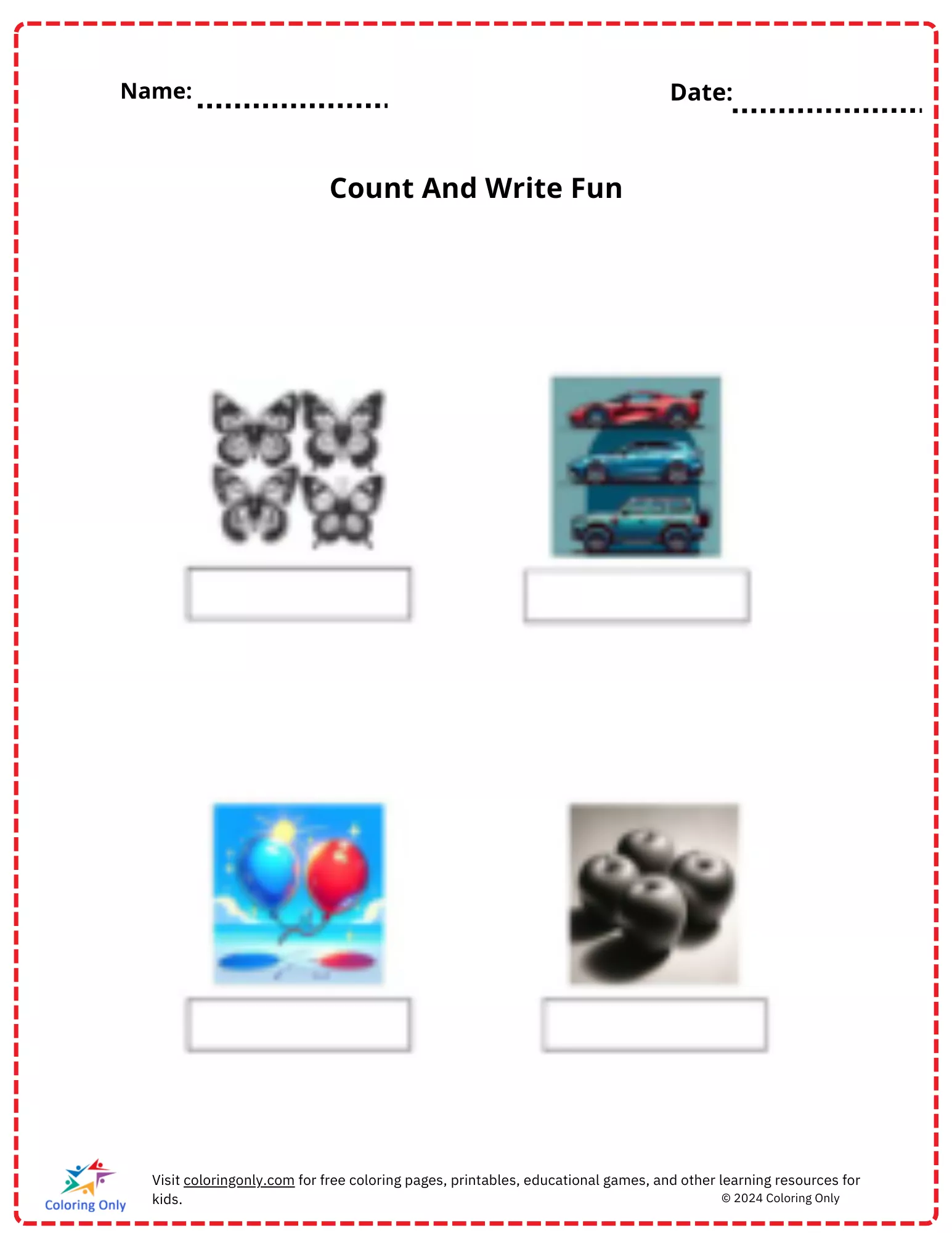 Das kostenlose druckbare Arbeitsblatt "Count And Write Fun " ist ein ansprechendes und lehrreiches Werkzeug für Vorschulkinder, um ihre Zähl- und Schreibfähigkeiten zu entwickeln. In diesem Arbeitsblatt werden die Kinder aufgefordert, die Objekte wie Schmetterlinge, Autos, Luftballons und Äpfel zu zählen und dann die entsprechenden Zahlen in die dafür vorgesehenen Felder zu schreiben. Mit hellen und lustigen Illustrationen ist das kostenlose druckbare Arbeitsblatt "Count And Write Fun " perfekt für Anfänger, um eine solide Grundlage in der Zahlenerkennung und Handschrift aufzubauen und dabei Spaß zu haben.