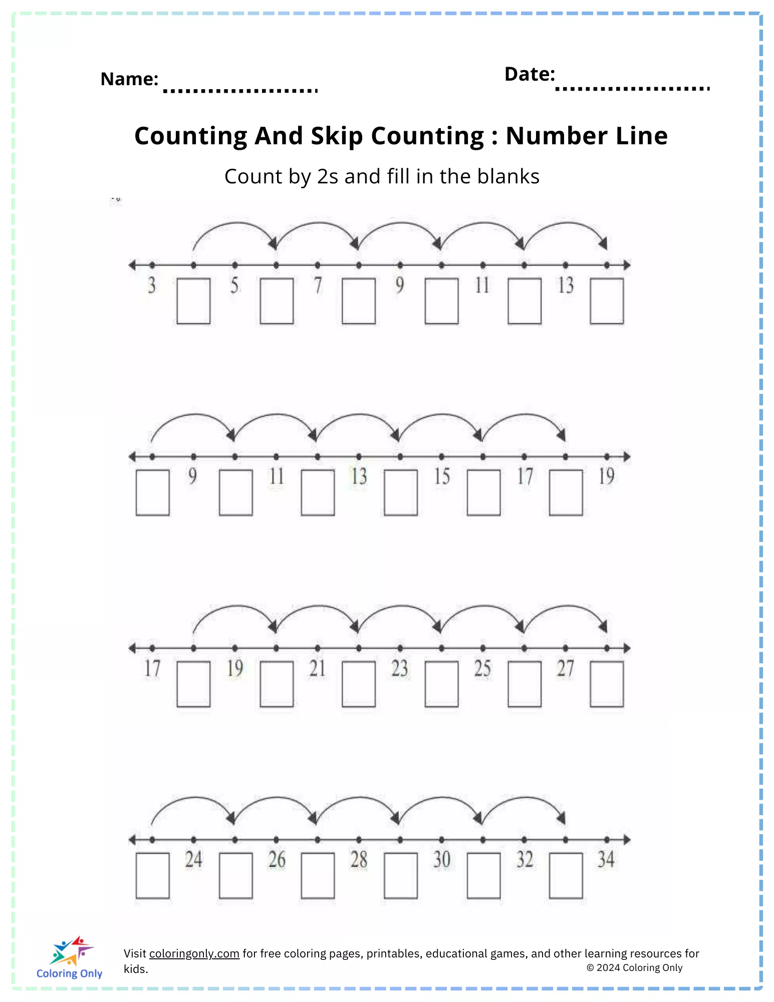 Verbessern Sie die Zählfähigkeiten Ihres Vorschulkindes mit dem "Zählen und Überspringen des Zählens: Zahlenstrahl kostenlos druckbares Arbeitsblatt".