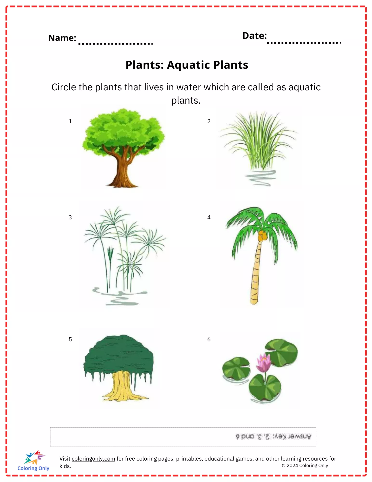 Dieses Arbeitsblatt hilft jungen Lernenden, im Wasser lebende Pflanzen, sogenannte Wasserpflanzen, zu identifizieren und einzukreisen.