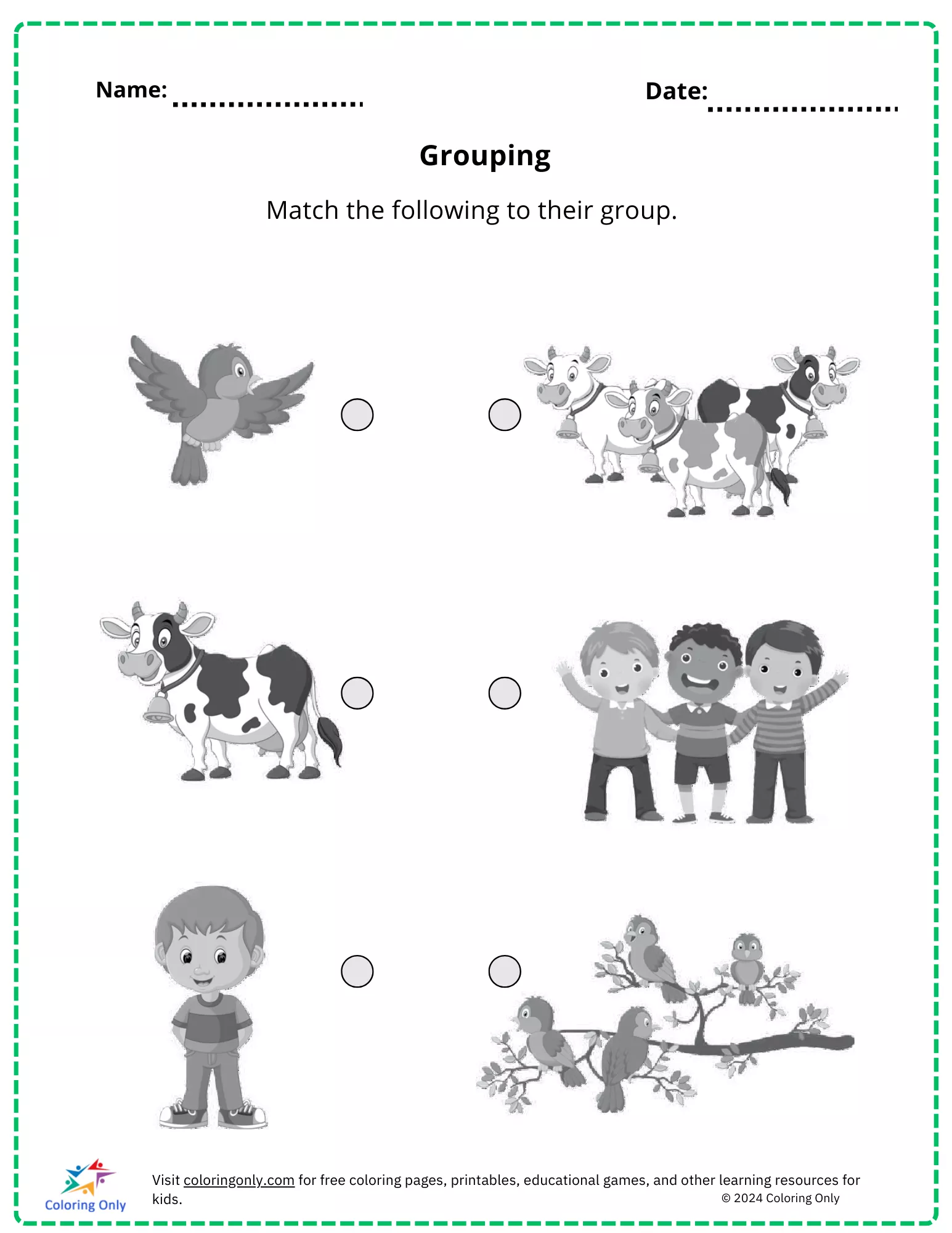 Das Arbeitsblatt enthält ansprechende Bilder, in denen Kinder einzelne Objekte wie Vögel, Kühe und Kinder der richtigen Gruppe zuordnen müssen.