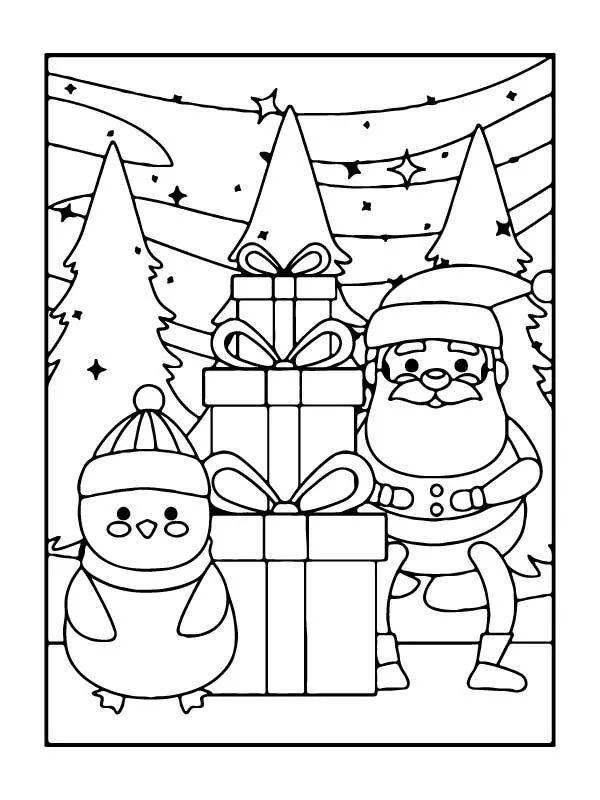 : Druckbar herunterladen Santa Claus, Gift, and Snowman Malvorlage