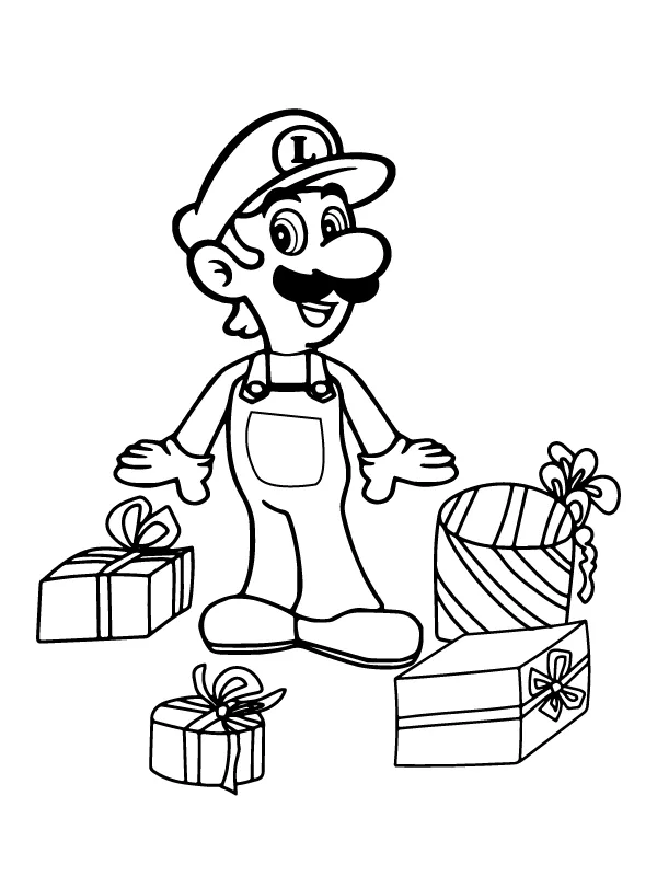 : Druckbar herunterladen Luigi mit Geschenken Malvorlage