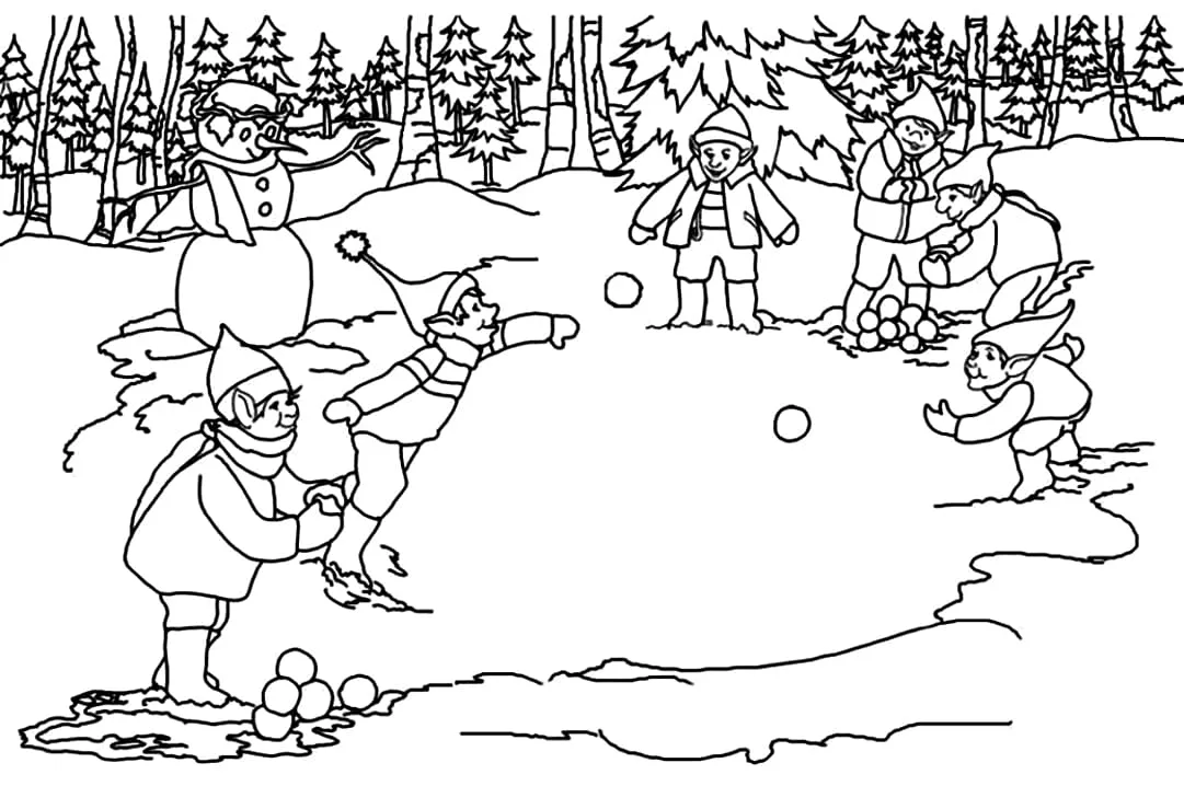 : Druckbar herunterladen Schneeballschlacht mit Elfen Malvorlage