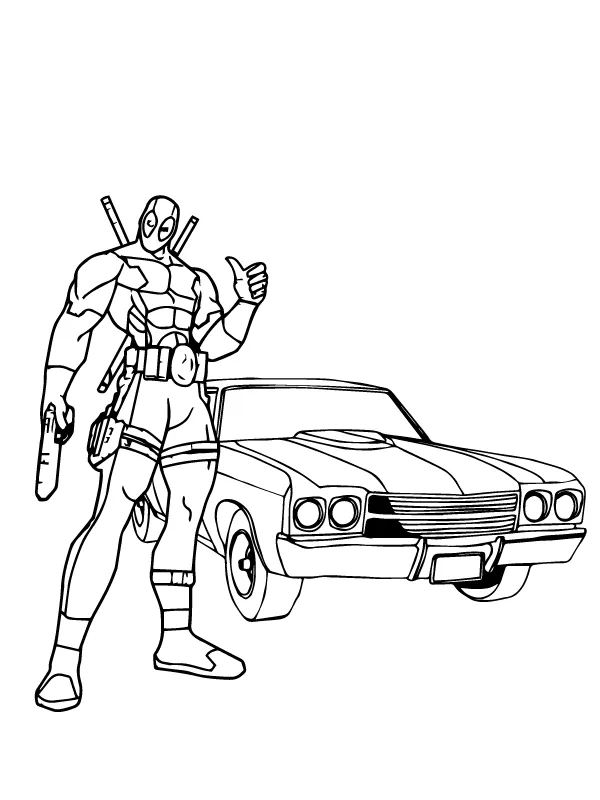 : Druckbar herunterladen Deadpool und Ford Mustang Malvorlage