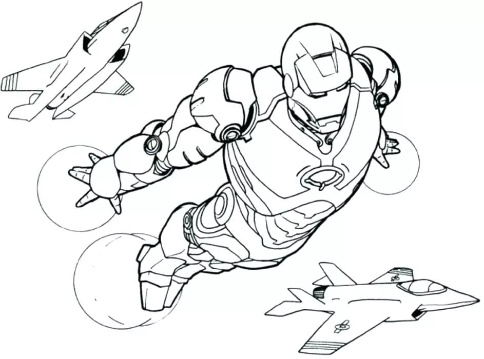 : Druckbar herunterladen Iron Man und Jets Malvorlage