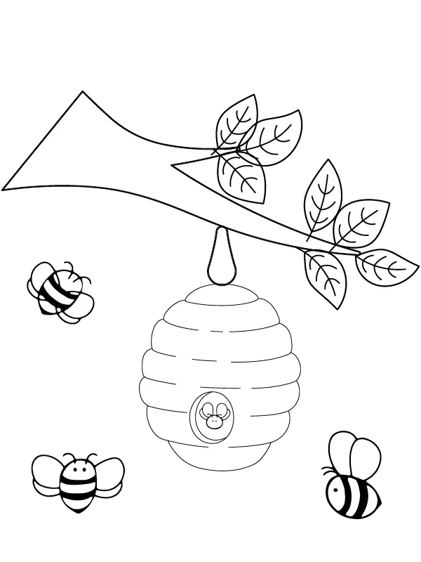 : Druckbar herunterladen Bienenstock und drei Bienen Malvorlage
