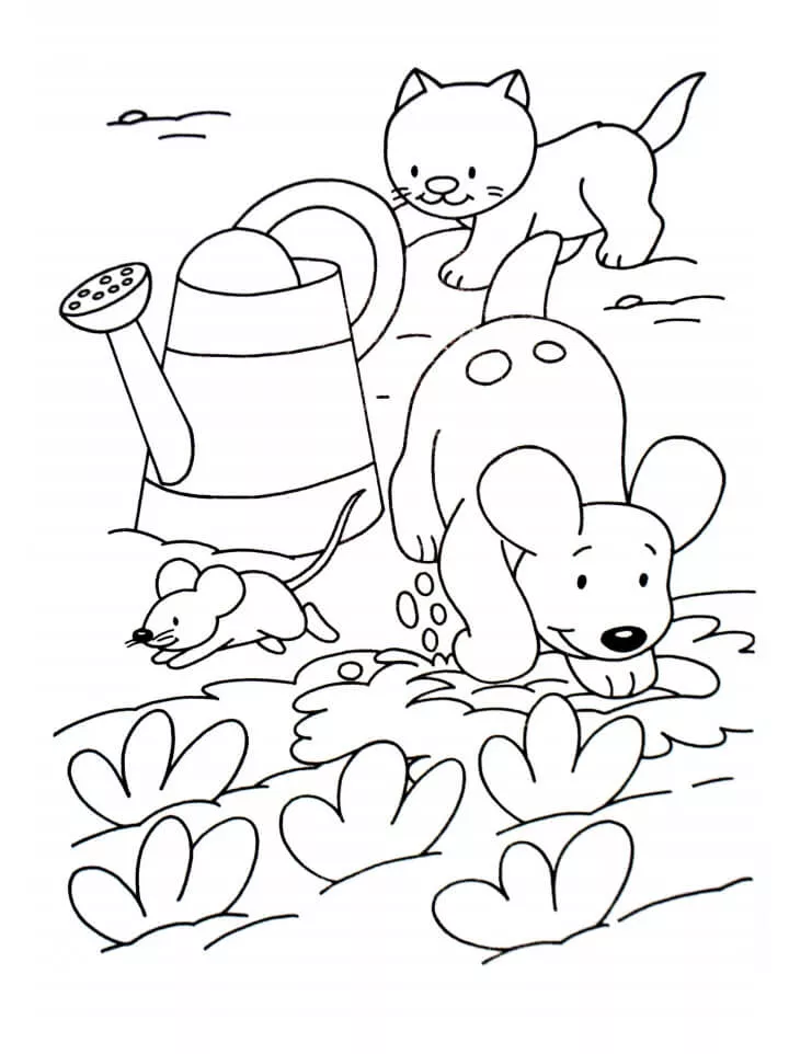 : Druckbar herunterladen Haustiere im Garten Malvorlage