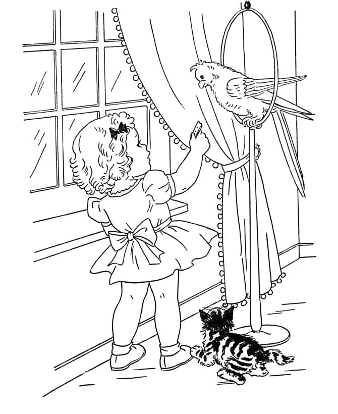 : Druckbar herunterladen Kleines Mädchen und Haustierpapagei Malvorlage