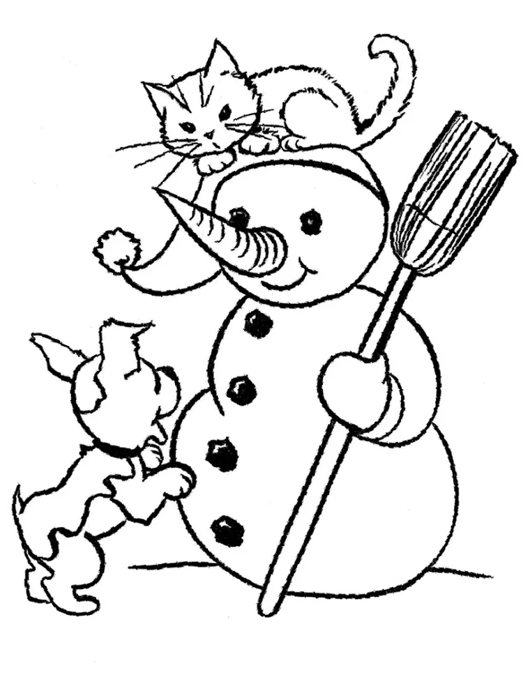 : Druckbar herunterladen Hund und Katze mit Schneemann Malvorlage