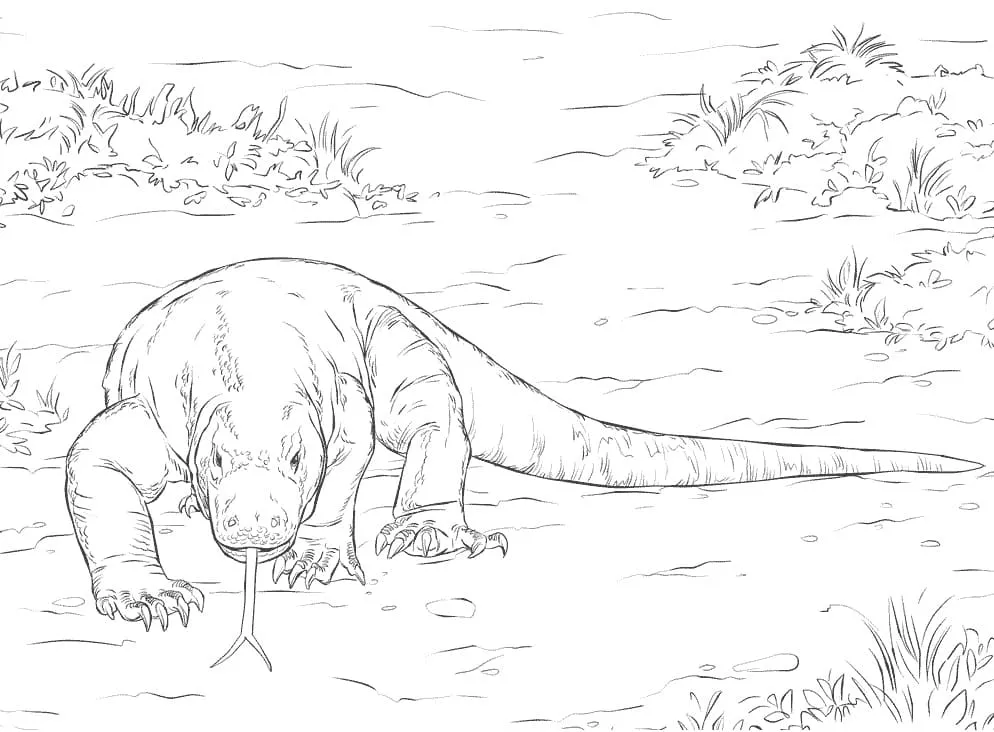 : Druckbar herunterladen Komodowaran auf dem Boden Malvorlage