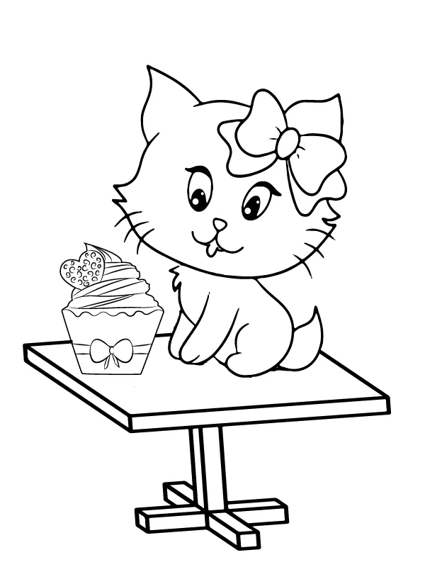 Beschreibung der Färbung : Druckbar herunterladen Entzückendes Kätzchen und Cupcake auf dem Tisch Malvorlage