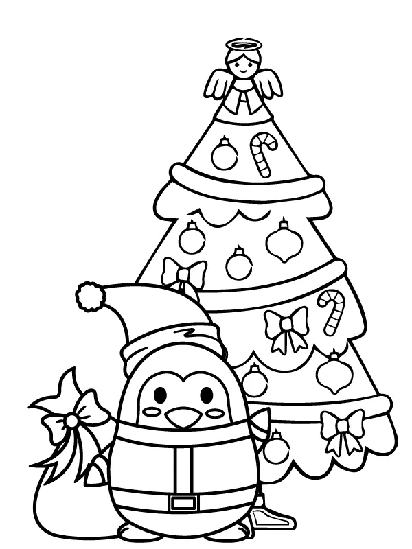 : Druckbar herunterladen Pinguin und Weihnachtsbaum Malvorlage