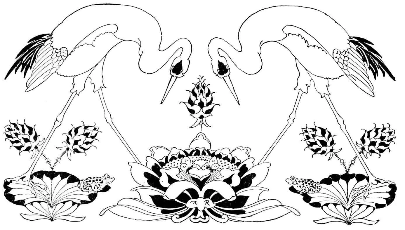 : Druckbar herunterladen Reiher und Blüten Malvorlage