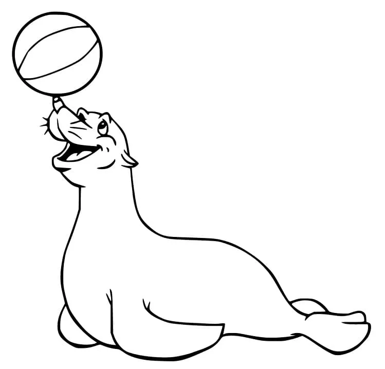 : Druckbar herunterladen Glücklicher Seelöwe spielt Ball Malvorlage