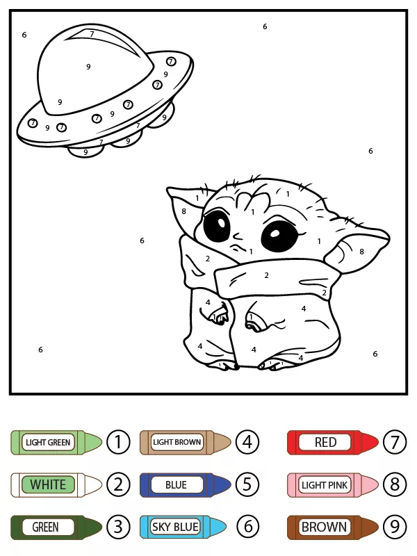 Beschreibung der Färbung : Druckbar herunterladen Baby Yoda und Raumschiff Malen nach Zahlen Malvorlage