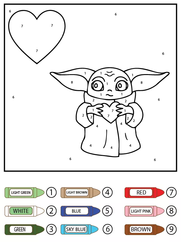 Beschreibung der Färbung : Druckbar herunterladen Schönes Baby Yoda und großes Herz Malen nach Zahlen Malvorlage
