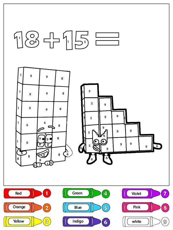 Beschreibung der Färbung : Druckbar herunterladen Achtzehn und fünfzehn Zahlenblöcke Malen nach Zahlen Malvorlage