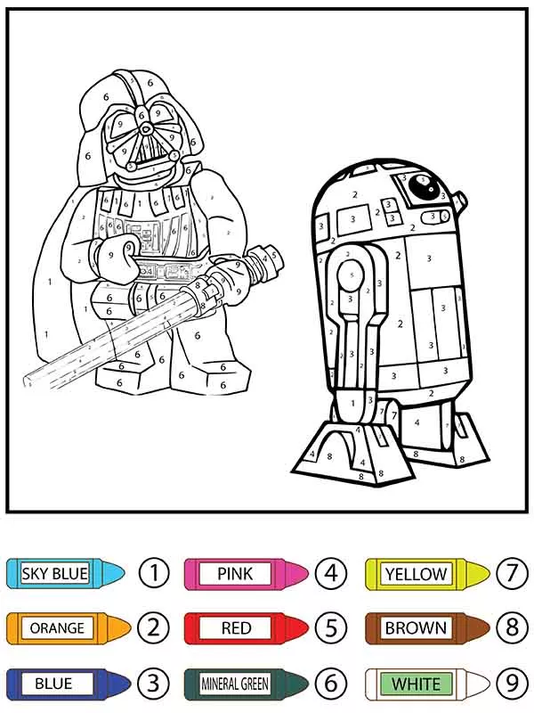 Beschreibung der Färbung : Druckbar herunterladen Darth Vader Lego und R2-D2 Malen nach Zahlen Malvorlage