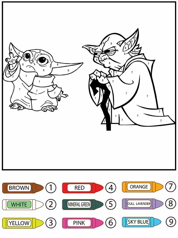 : Druckbar herunterladen Grogu und Baby Yoda Malen nach Zahlen Malvorlage
