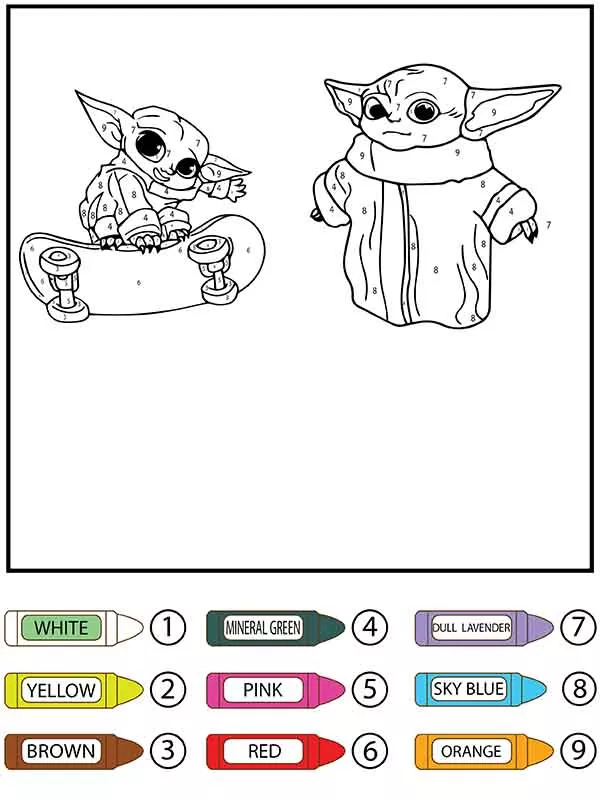Beschreibung der Färbung : Druckbar herunterladen Star Wars Baby Yoda Schlittschuhlaufen Malen nach Zahlen Malvorlage