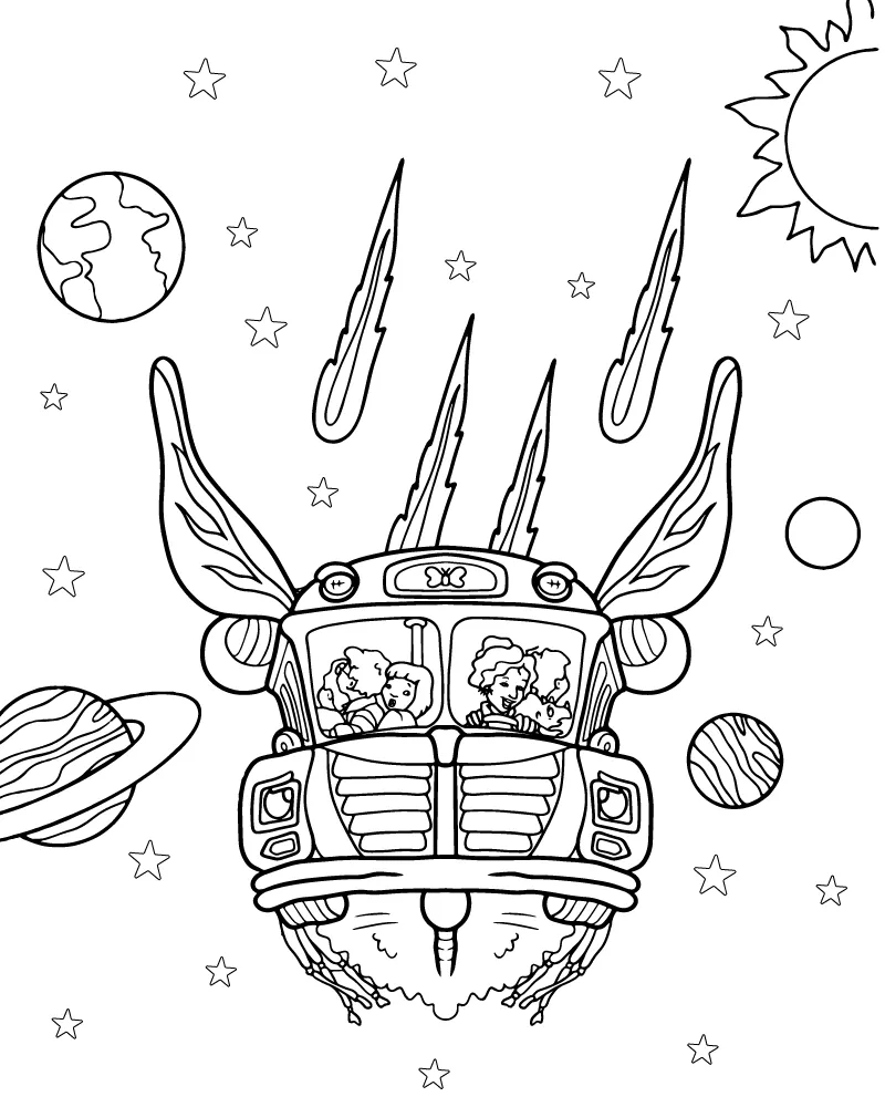 : Druckbar herunterladen Magischer Schulbusraum Malvorlage