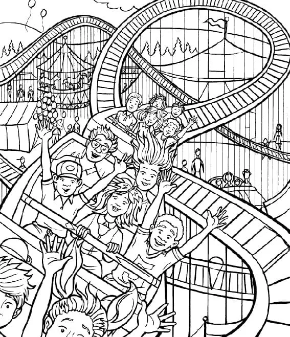 : Druckbar herunterladen Kinder auf Achterbahn Malvorlage